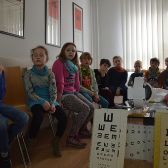 Rucksackschule - ganz ohne Rucksack dieses Mal! Denn der Weg zum Augenzentrum in der Leiterstraße ist nicht weit. Hier erfuhren die Schülerinnen und Schüler der Klasse 2B am 4. April 2016 alles Wissenswerte zum Thema "Warum Alexander eine Brille trägt".