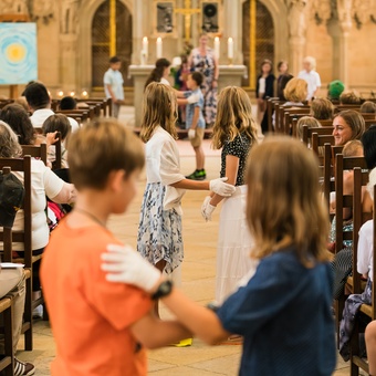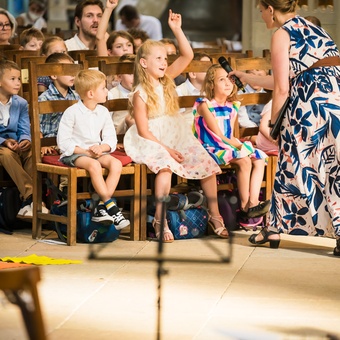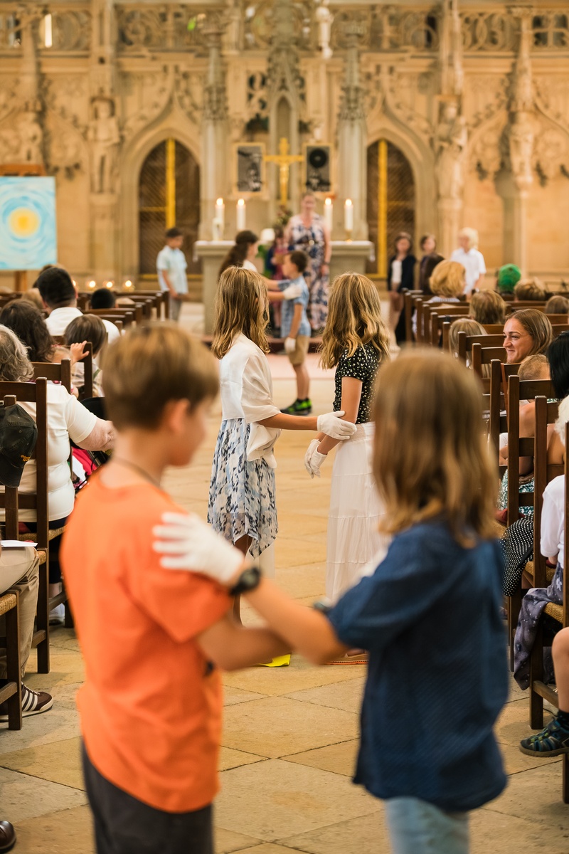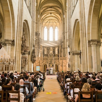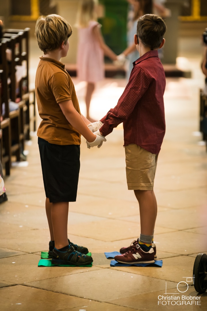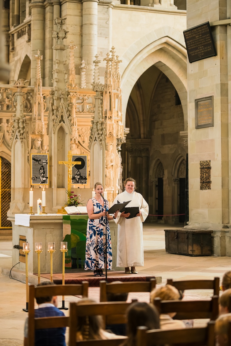 In der Sakristei wurde die erste Aufgeregtheit genommen bevor in den Dom eingezogen wurde. Eine festliche Gemeinde erwartete die Kinder schon. Nach einer feierlichen Begrüßung durch Frau Schöpe und Frau Fitz konnte schon das erste Lied erklingen. Sogar unsere jüngsten Schulgemeinschaftsmitglieder konnten schon ihre Stimmen ausprobieren.