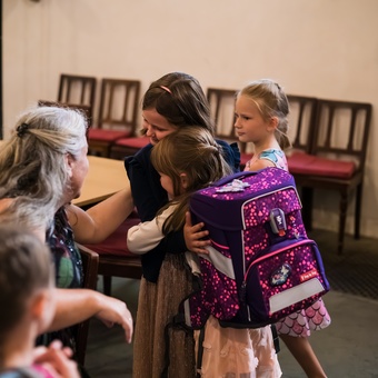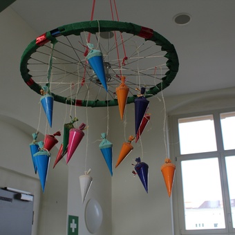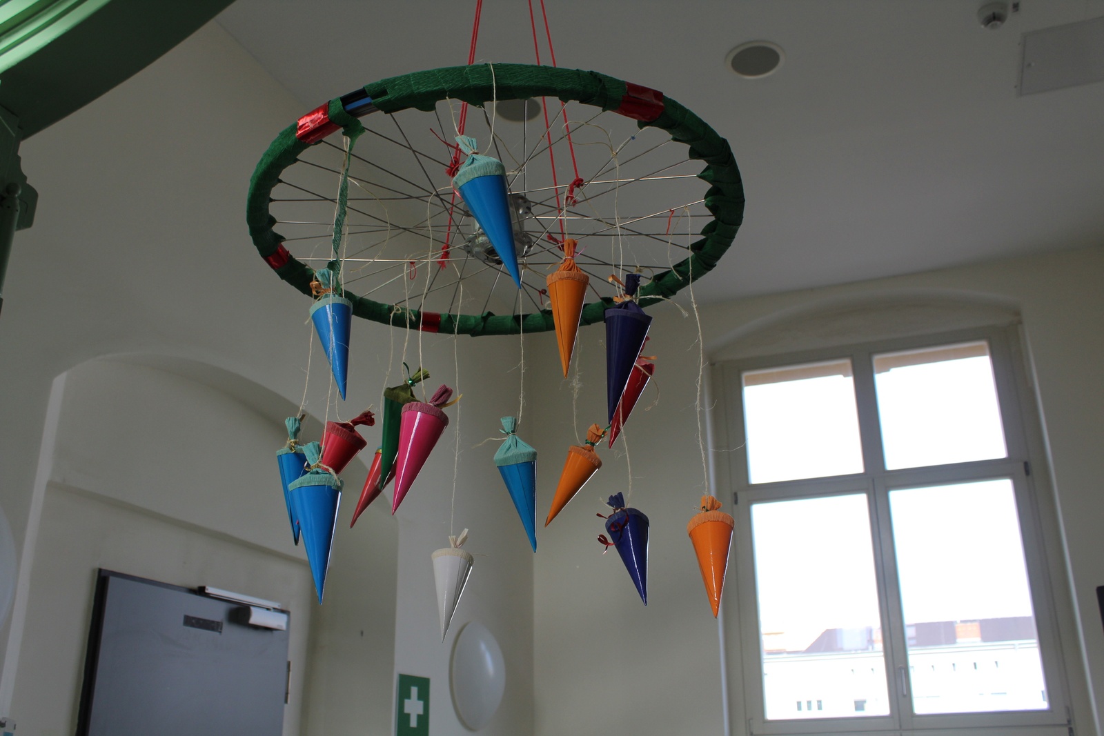 Während der Predigt von Frau Fitz konnten die Kinder intensiv die Hände studieren und die Lebenslinie suchen. In der ersten Schulwoche haben die Kinder ihre Handabdrücke bunt gestaltet und ausgeschnitten. Diese wurden nun an einer Leinwand befestigt. Dazu wurde jedes Kind aufgerufen und hat seine „Hand“ nach vorn gebracht. Im Anschluss wurden die Kinder gesegnet und in der Schulgemeinschaft begrüßt. Ein kleiner Schlüsselanhänger mit dem heutigen Psalm soll die Kinder noch lange an den eigenen Einschulungsgottesdienst erinnern und wurde jedem Einschulungskind nach der Erteilung des Segens überreicht. Die musikalische Begleitung der Leinwandgestaltung und der Erteilung des Segens durch Klavier und Posaune untermalte die feierliche Stimmung.