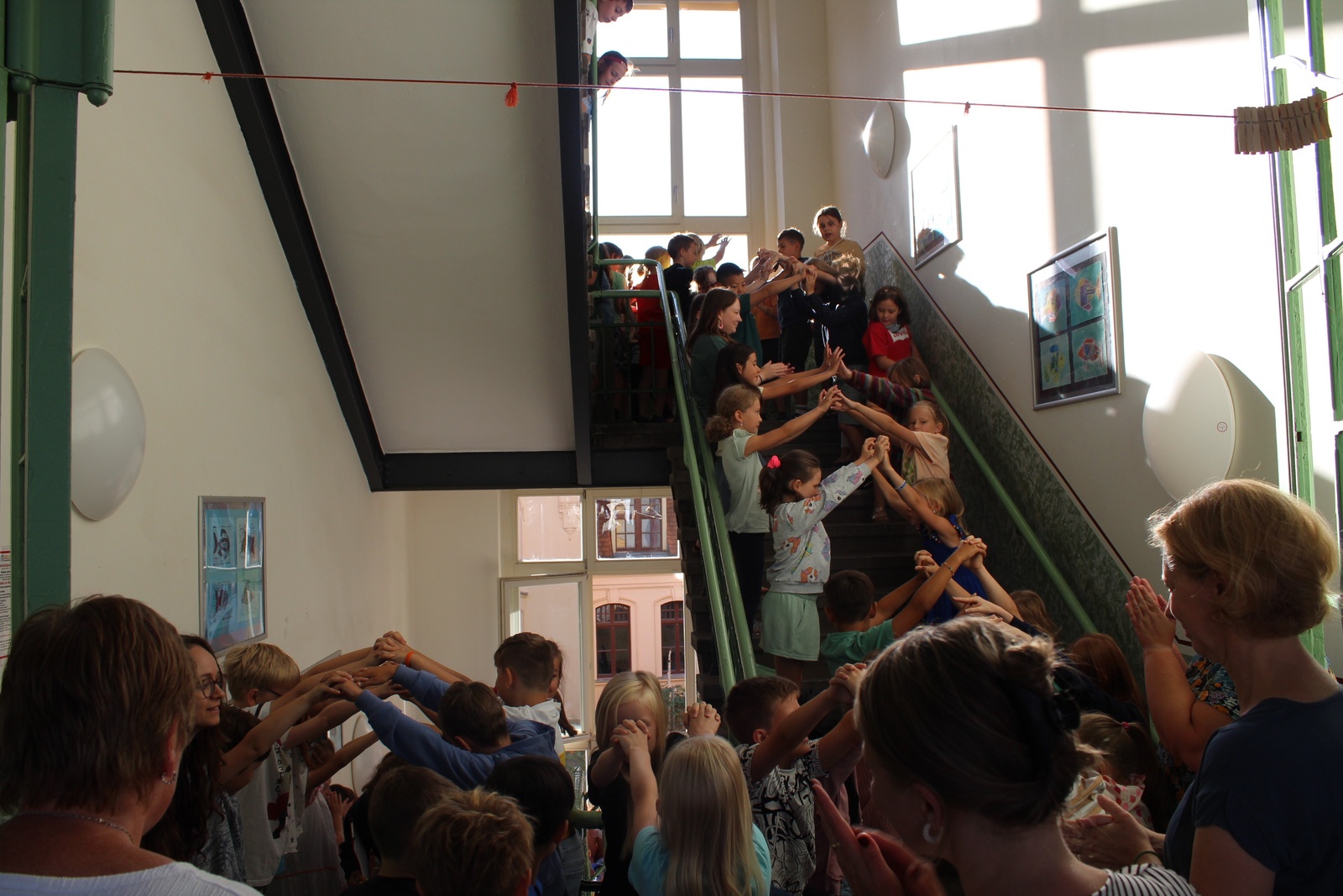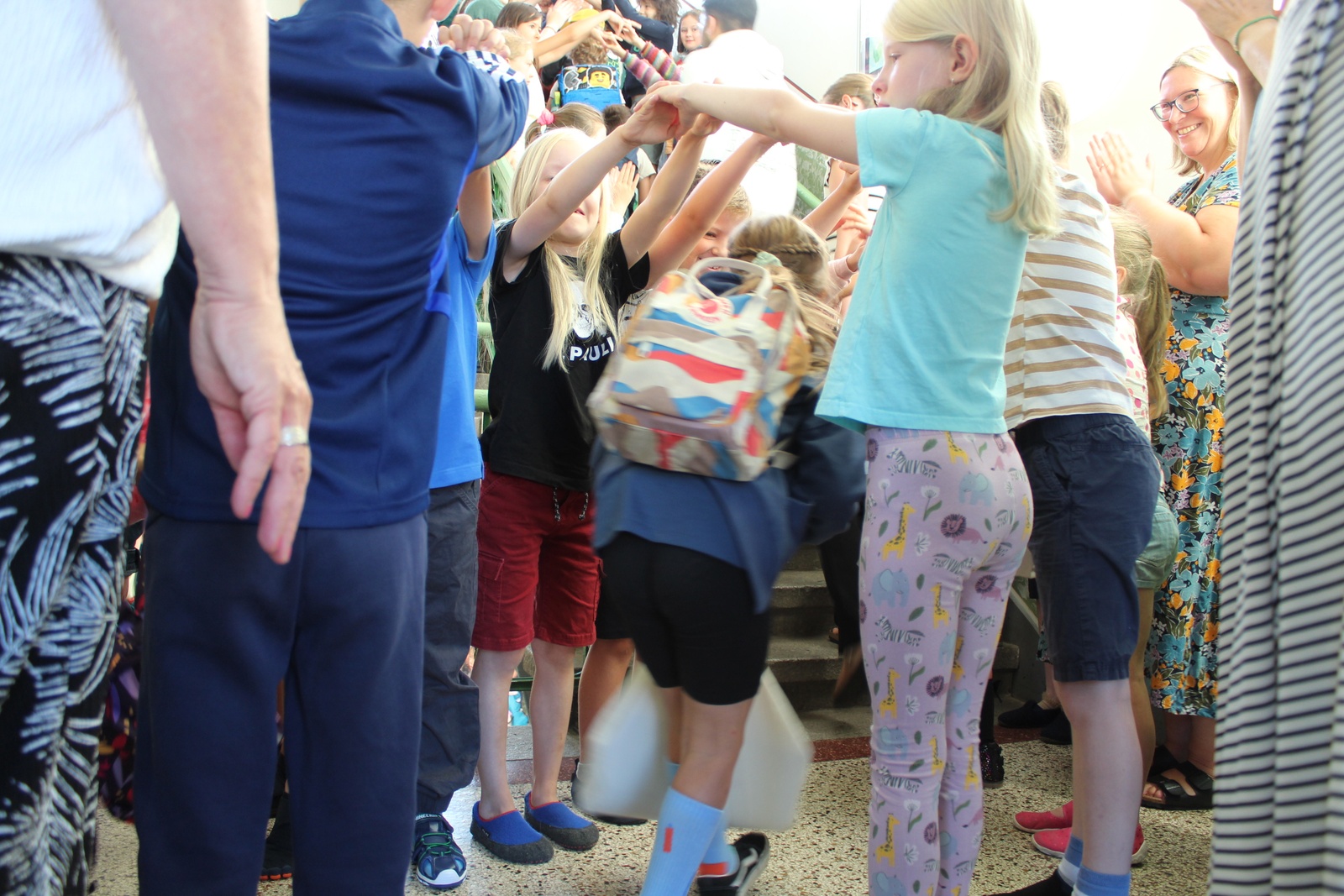 Sie laufen durch ein Spalier der Klassen 2 – 4 zu ihrem Klassenzimmer und werden mit Klatschen im Schulhaus begrüßt.