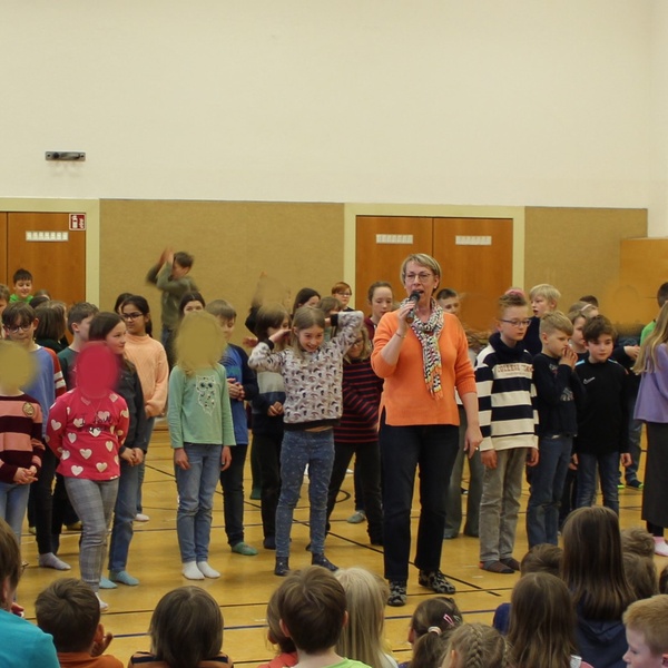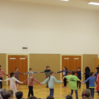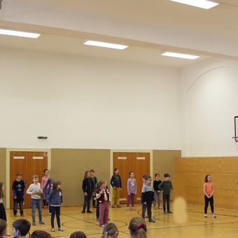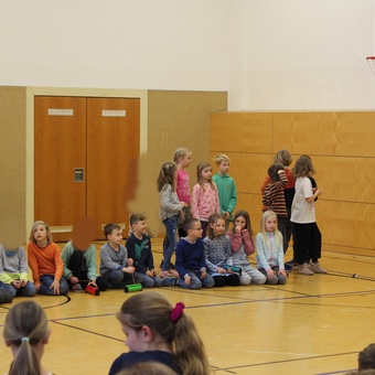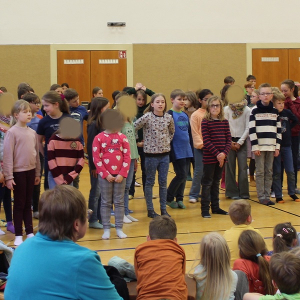 Es schloss – ganz schön aufgeregt – die Klasse 1a mit dem ersten Beitrag an. Das Lied „Kuckuck, Kuckuck, ruft´s aus dem Wald“ wurde nicht nur gesungen, sondern auch mit Klanghölzern, Tambourin und Metallophon begleitet. Applaus und Jubel bestätigte die kleinen Künstler und Künstlerinnen und so fiel es der Klasse 1b schon etwas leichter, mit ihrem Tanz vor die Schulgemeinschaft zu treten. Die Klasse sang und tanzte mit viel Freude und steckte so das Publikum an.