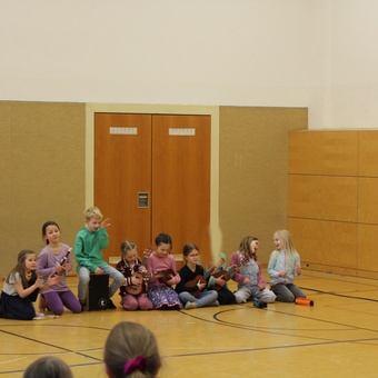 Aus den Klassen 2a und 2b bilden Kinder jedes Jahr eine Musik-AG. Diese wollte natürlich auch nicht verpassen zu präsentieren, was sie alles gelernt haben. So kamen die Zuschauenden in den Genuss eines Musikstückes mit Ukulelen, Cajon, einer Soloflöte und klingenden Metallophontönen.