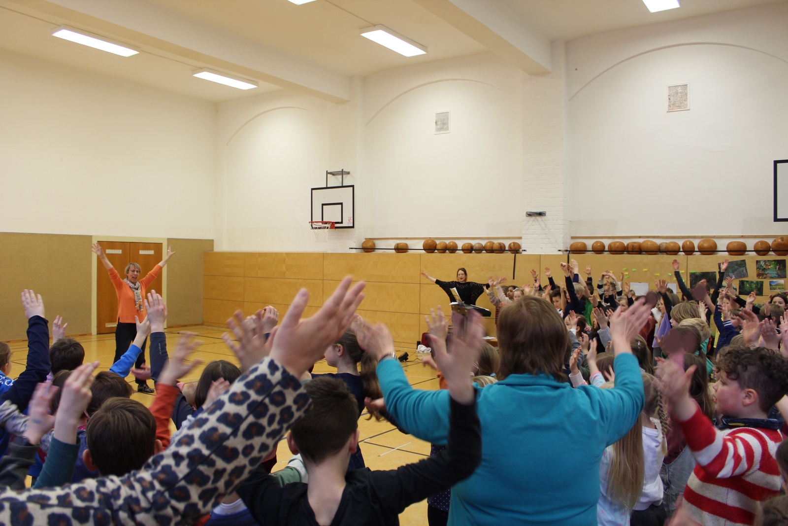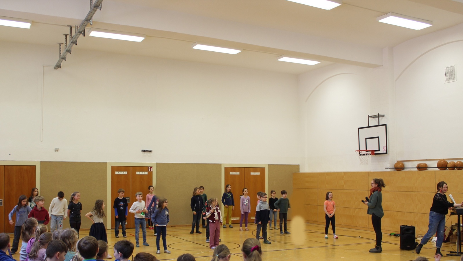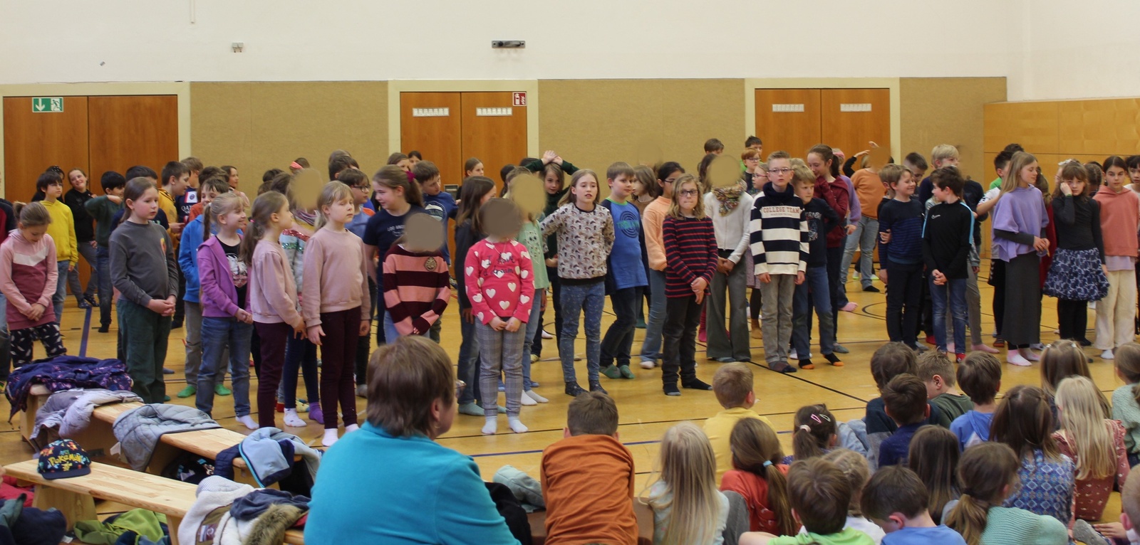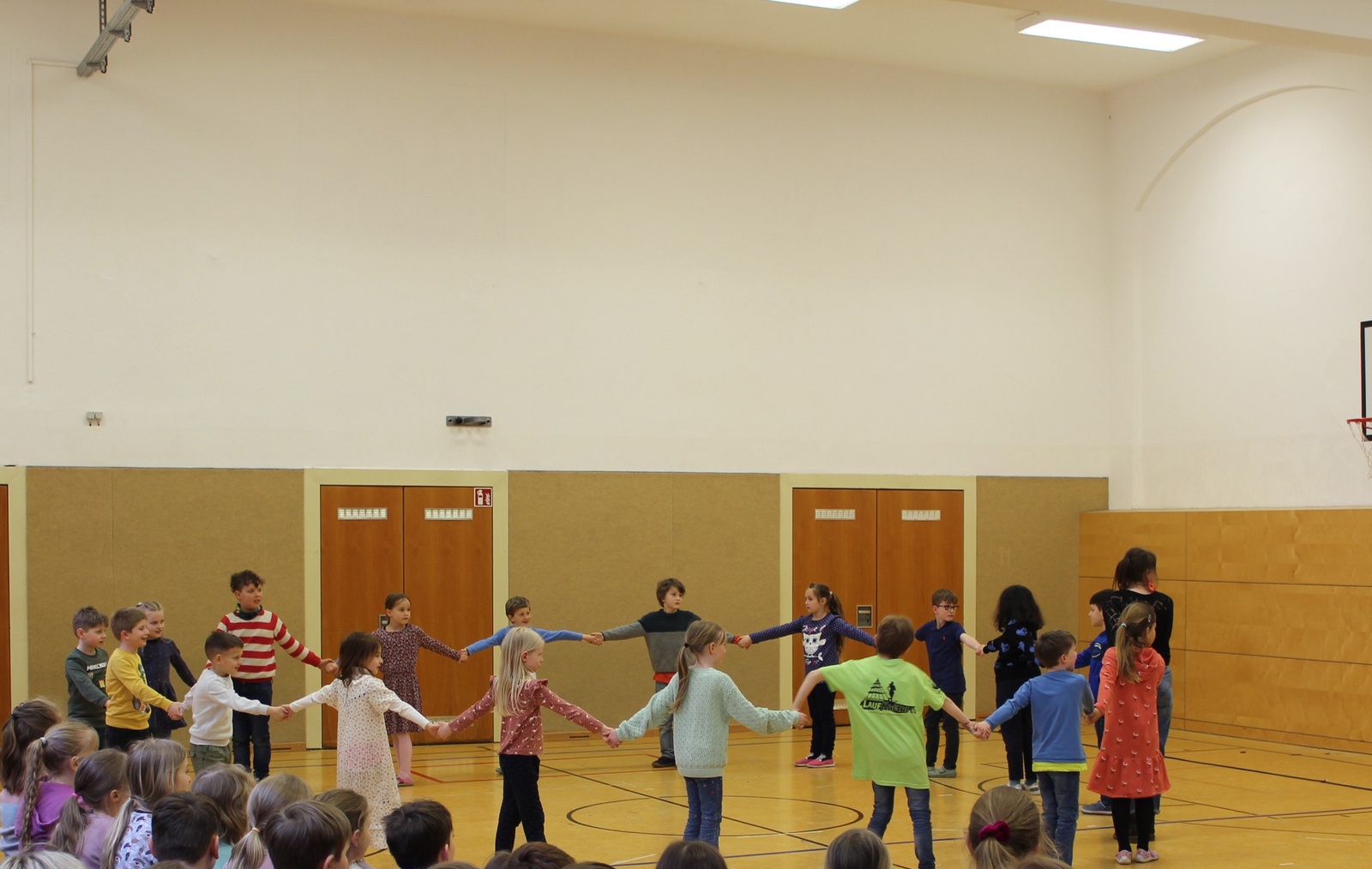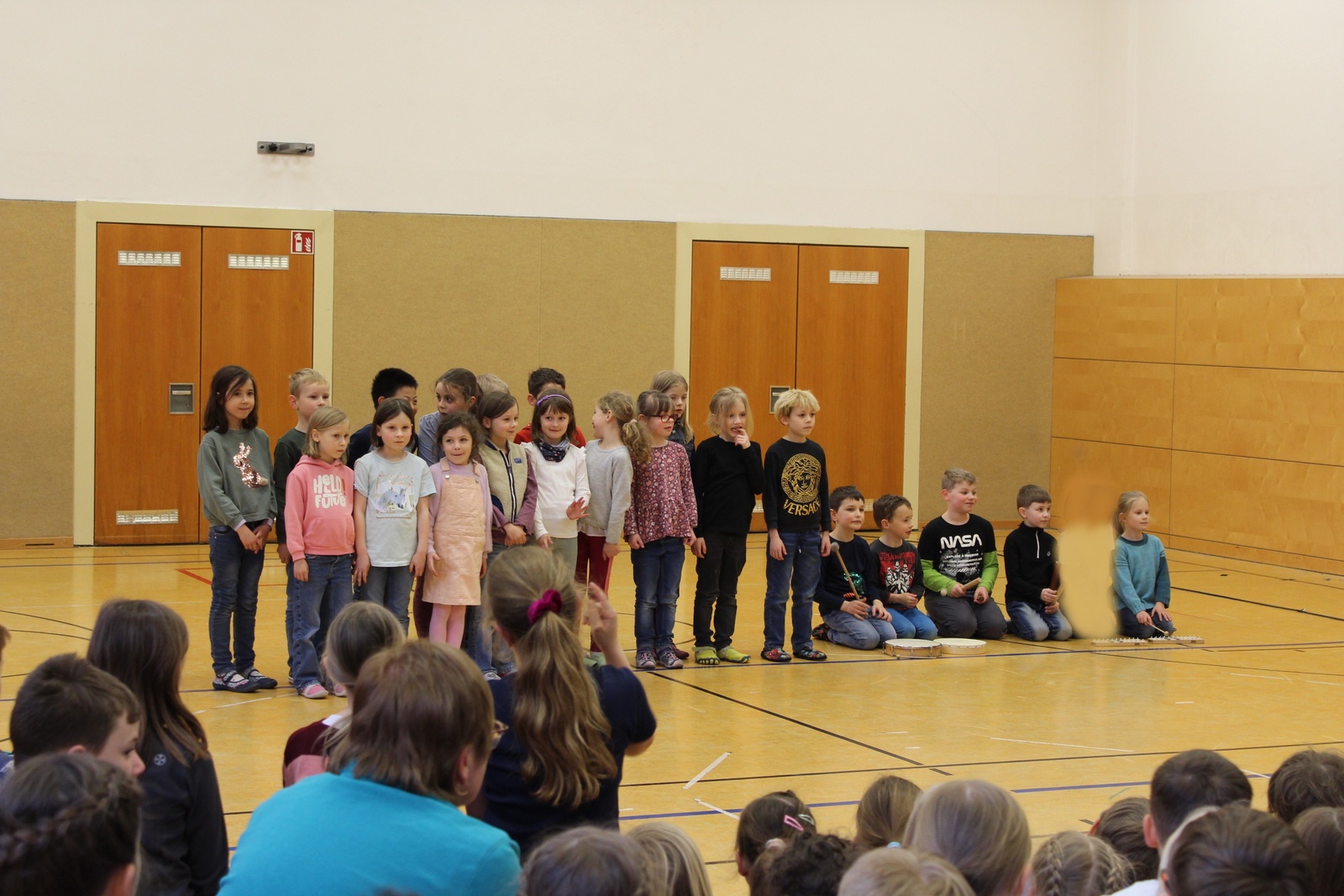 Es schloss – ganz schön aufgeregt – die Klasse 1a mit dem ersten Beitrag an. Das Lied „Kuckuck, Kuckuck, ruft´s aus dem Wald“ wurde nicht nur gesungen, sondern auch mit Klanghölzern, Tambourin und Metallophon begleitet. Applaus und Jubel bestätigte die kleinen Künstler und Künstlerinnen und so fiel es der Klasse 1b schon etwas leichter, mit ihrem Tanz vor die Schulgemeinschaft zu treten. Die Klasse sang und tanzte mit viel Freude und steckte so das Publikum an.