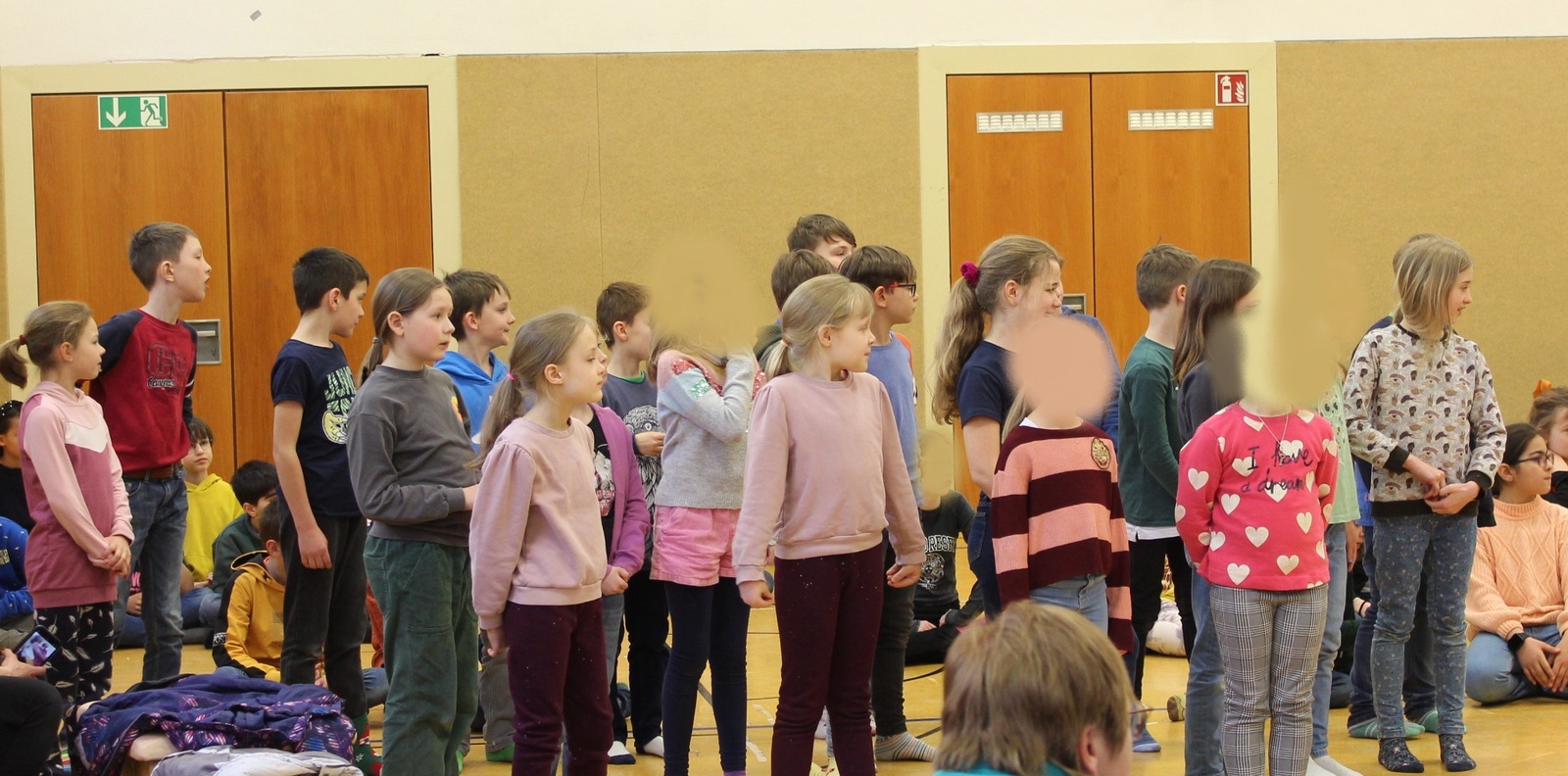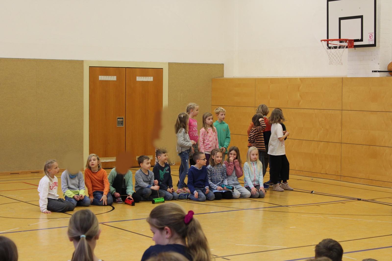 Nun waren endlich die „Großen“ an der Reihe. Die Klassenstufen 3 und 4 führten einige Lieder des Kindermusicals „Gerempel im Tempel“ von Klaus Müller auf. Dank einleitender und zwischendurch erläuternder Worte zum Geschehen, konnten alle Zuschauenden dem Beitrag gut folgen. Begeistert lauschten die Kinder der Klassen 1 und 2 dem musikalischen Beitrag.