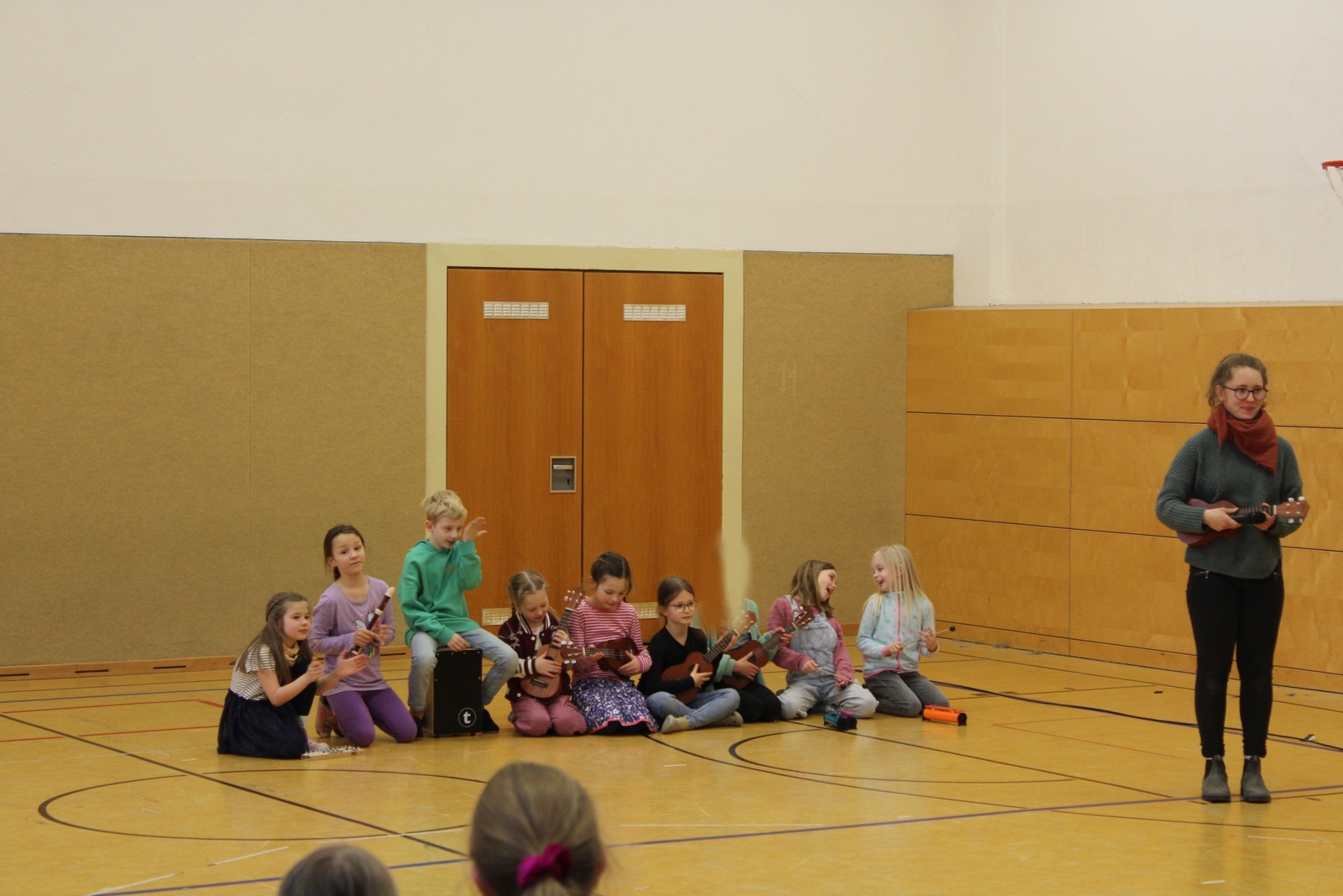 Aus den Klassen 2a und 2b bilden Kinder jedes Jahr eine Musik-AG. Diese wollte natürlich auch nicht verpassen zu präsentieren, was sie alles gelernt haben. So kamen die Zuschauenden in den Genuss eines Musikstückes mit Ukulelen, Cajon, einer Soloflöte und klingenden Metallophontönen.