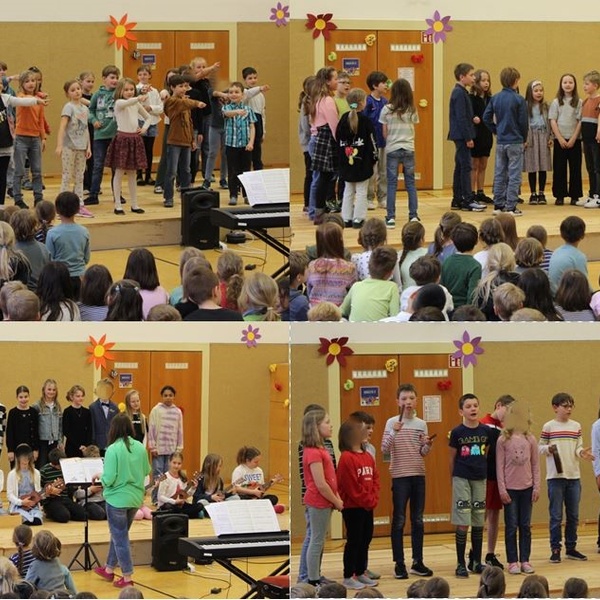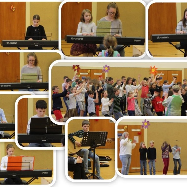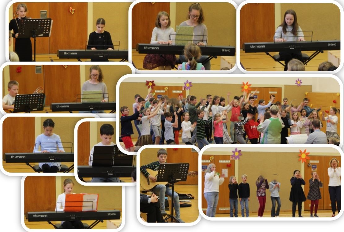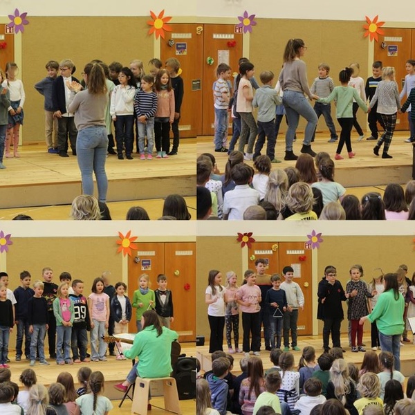 Begleitet vom Gitarrenspiel und der Triangel sangen die Kinder „Willkommen im Frühling“. Zwischen den Beiträgen beider zweiten Klassen glänzte ein Schüler der Klasse 2a mit einem Soloauftritt am Klavier. Es gehörte eine besondere Portion Mut dazu, so ganz allein dem Publikum gegenüberzutreten. Die Klasse 2b folgte mit einem Frühlings-Rhythmical und begeisterte damit das Publikum. Auch in dieser Klasse fand sich ein besonders mutiges Kind und spielte am Klavier als Solist ein Stück.