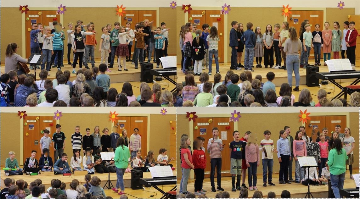 „I like the Flowers“ hieß es dann zum Ende des Konzertes von der Klasse 4b. Auch dieses Stück begleiteten die Kinder instrumental mit Klanghölzern, Tamburin und Metallophon. Als Abschluss konnten noch zwei Kinder der 4b zeigen, was sie am Klavier und auf der Gitarre spielen können.