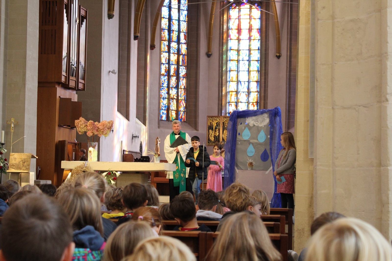 Das Thema des Gottesdienstes „Wasser ist kostbar“ ist wichtig und muss immer wieder mit den Kindern besprochen werden. Wasser kann nicht gemacht werden, es wird von Gott geschenkt. Es ist lebenswichtig und lässt Pflanzen wachsen und versorgt alle Lebewesen. Die Rhythmus-AG veranschaulicht diese Wichtigkeit mit dem Lied „Weil Gott das Wasser schenkt“, das dazu aufruft, Wasser als kostbar zu begreifen und sparsam damit umzugehen.