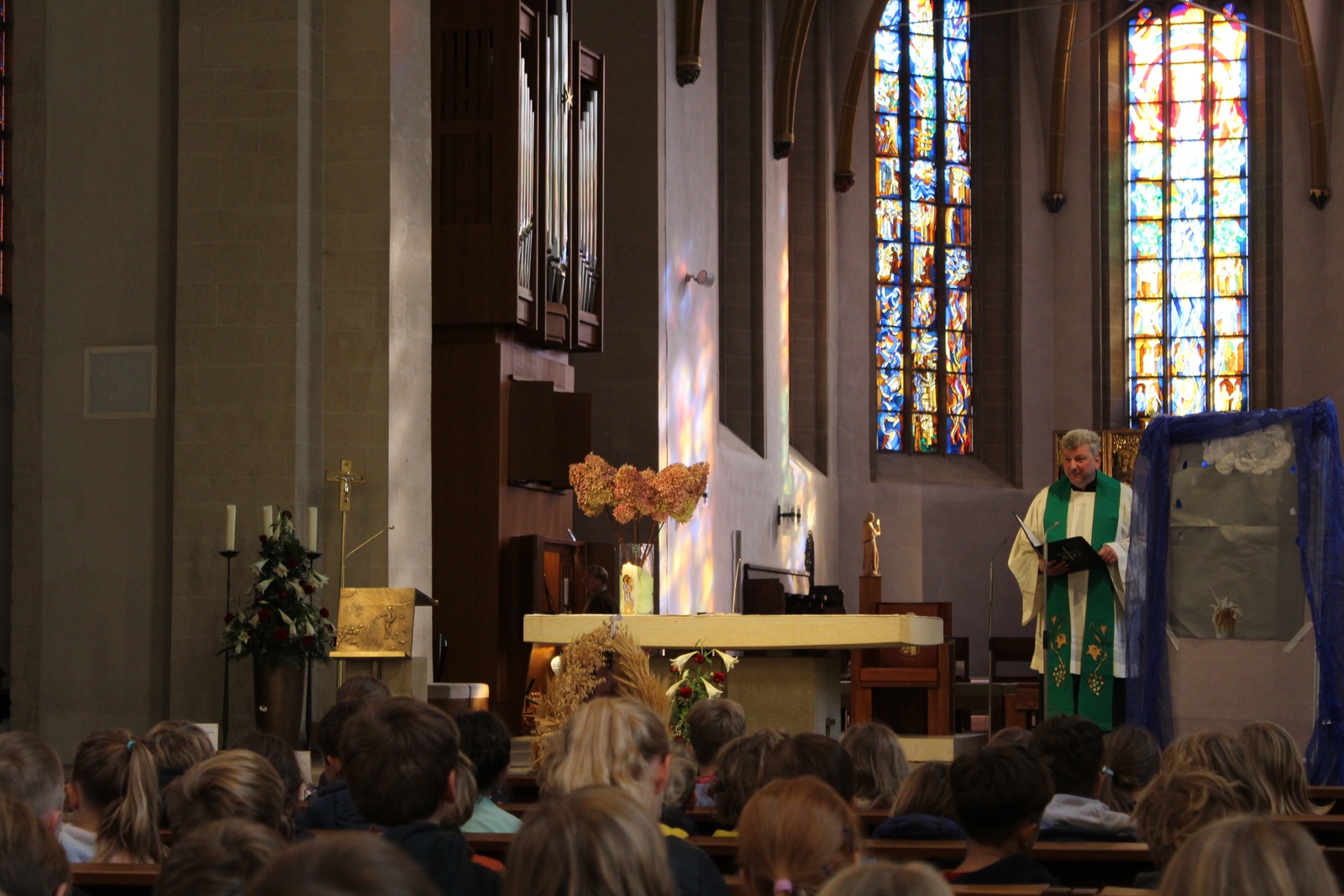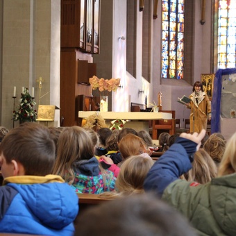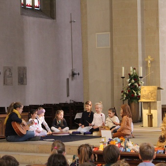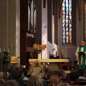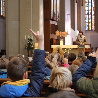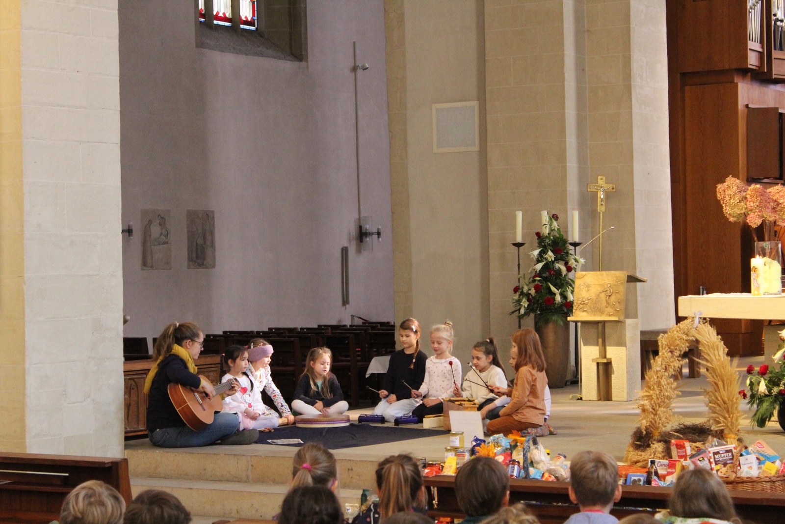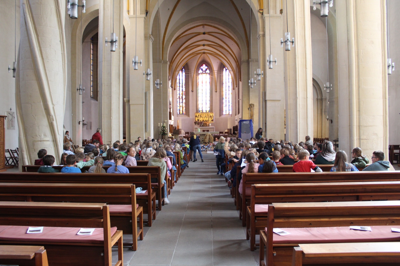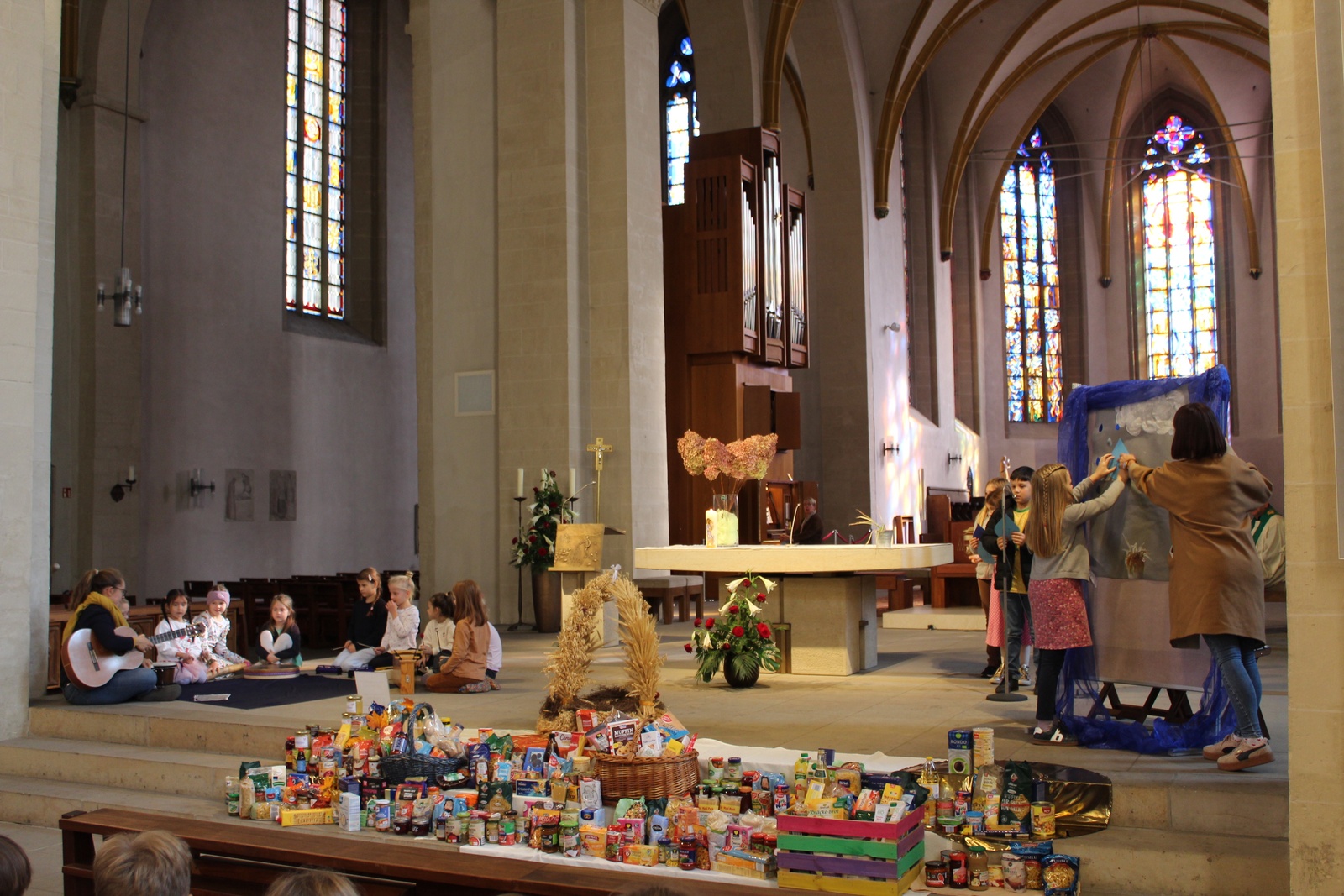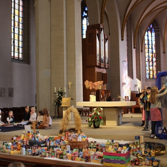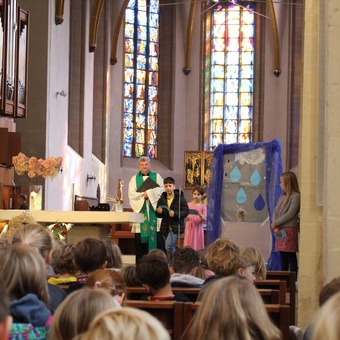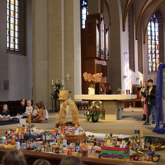 Am Donnerstag, 02.10.2025 feierte die Domgrundschule den Erntedank-Gottesdienst in der Kathedralpfarrei St. Sebastian. Die Erntekrone schmückte den Gabentisch, der, dank der Spenden der Kinder, prall gefüllt war.