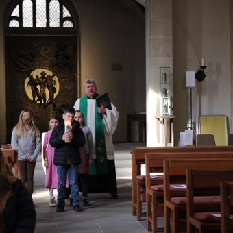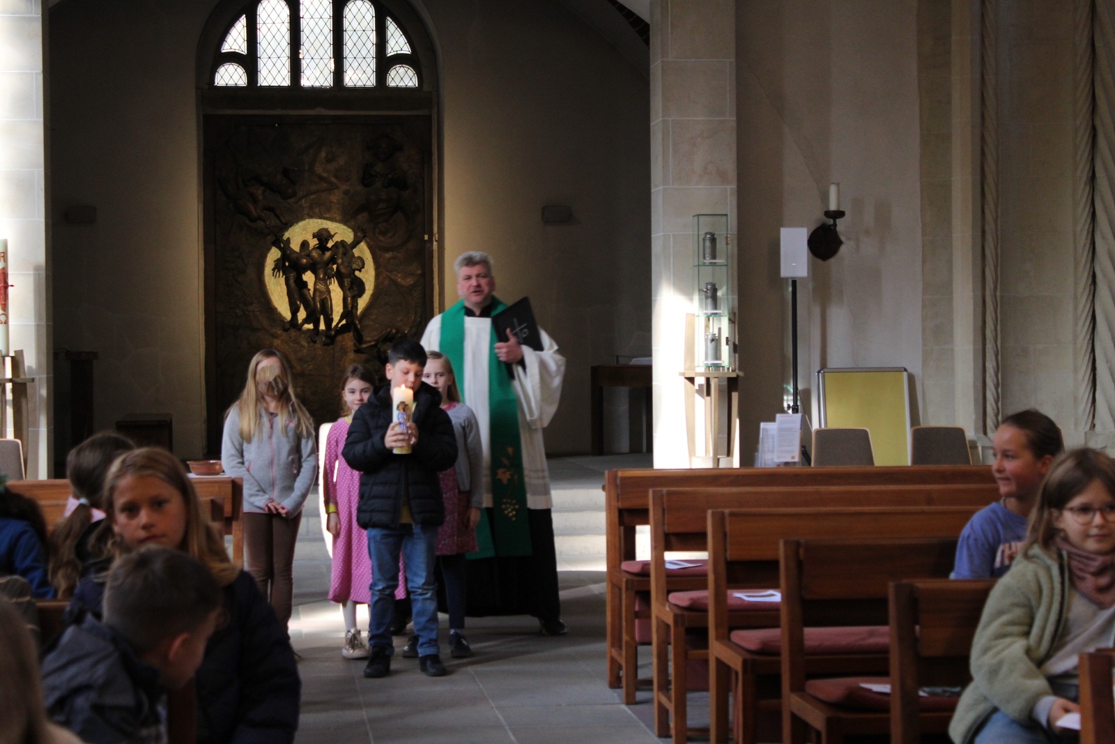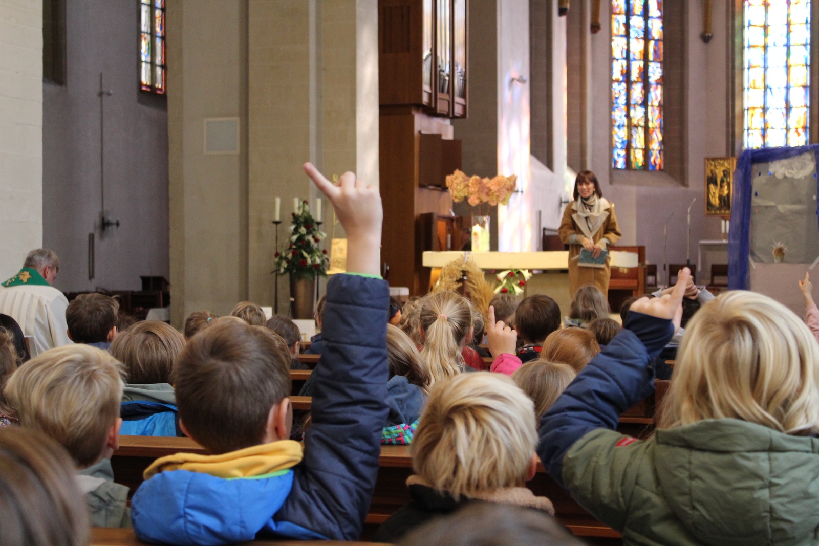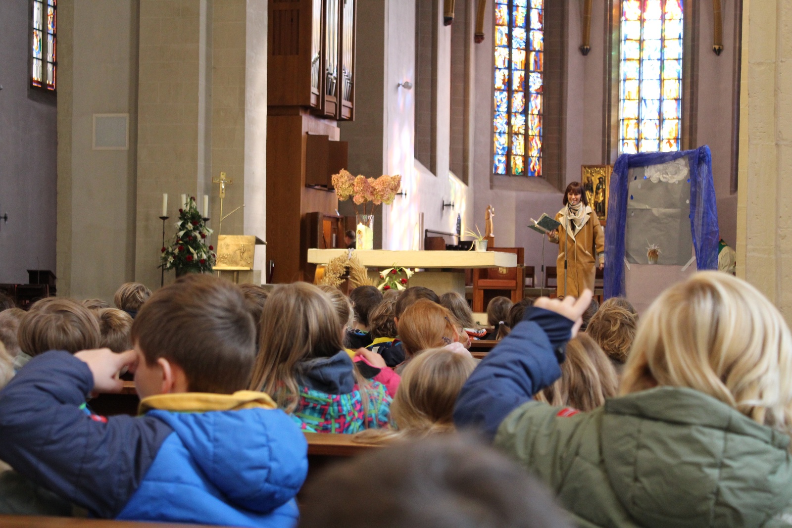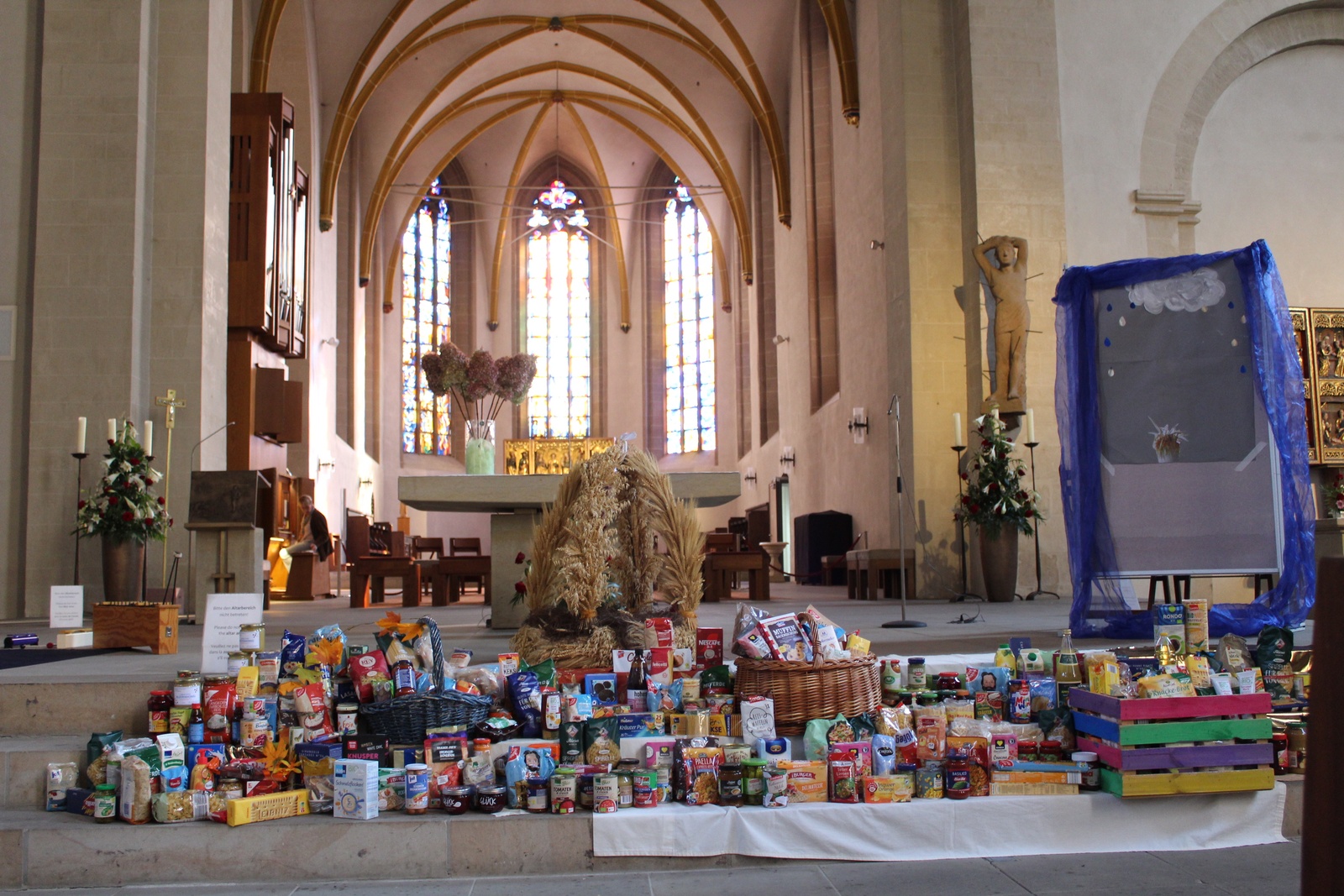 Am Donnerstag, 02.10.2025 feierte die Domgrundschule den Erntedank-Gottesdienst in der Kathedralpfarrei St. Sebastian. Die Erntekrone schmückte den Gabentisch, der, dank der Spenden der Kinder, prall gefüllt war.