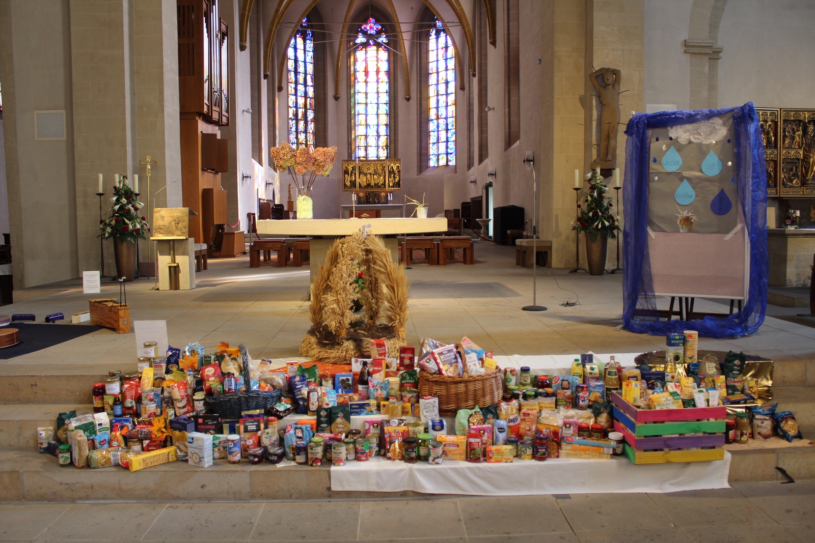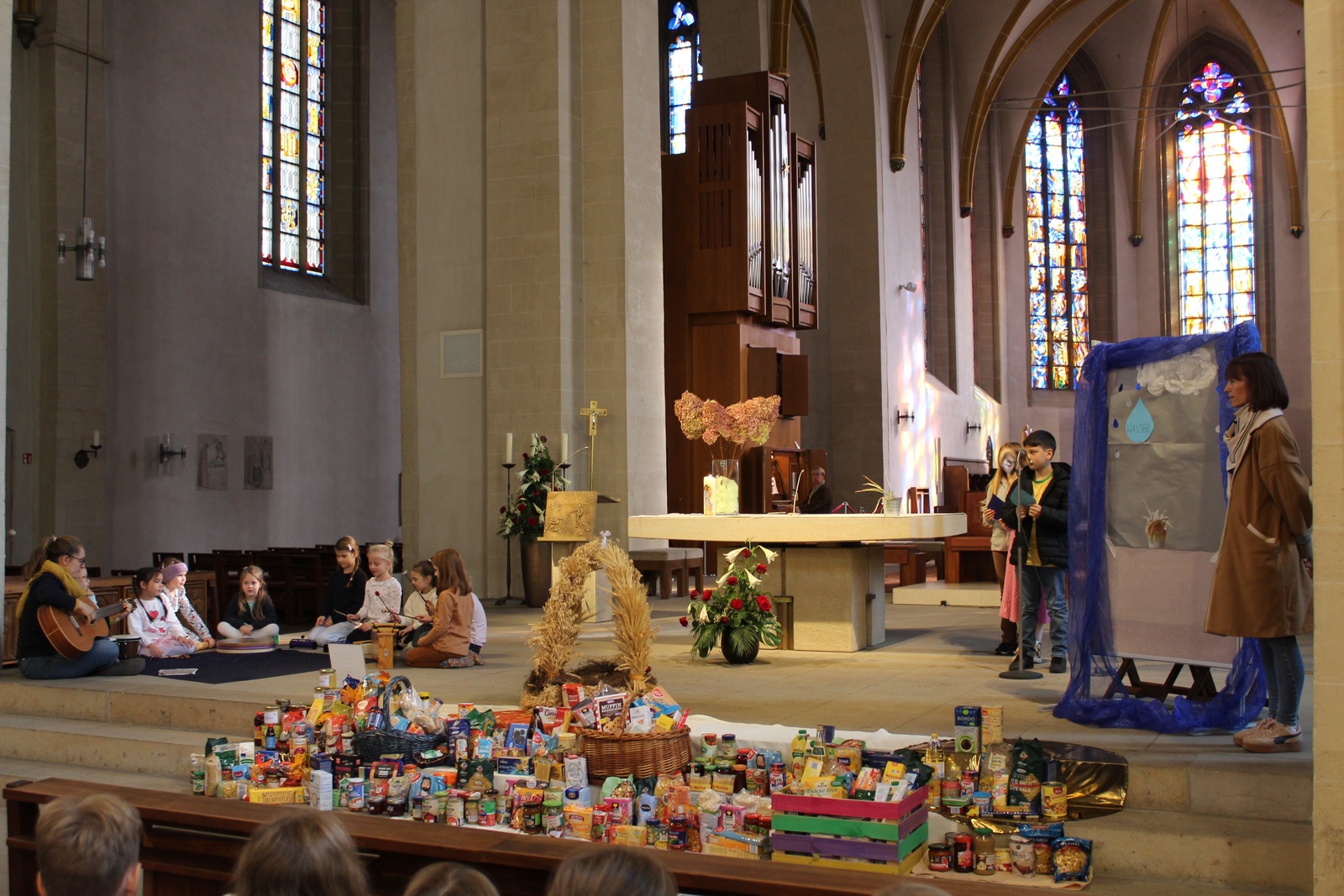 Als Schulgemeinde wurden die Lieder „Du hast uns deine Welt geschenkt“ und „Wenn wir unsre Gaben bringen“ gesungen und das Anspiel der Kinder der Kl. 3b verfolgt. Es wurden die einzelnen Bereiche ausgeführt, in denen Wasser besonders wichtig ist.