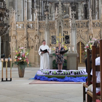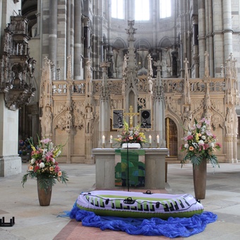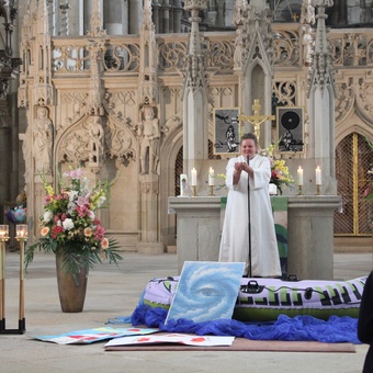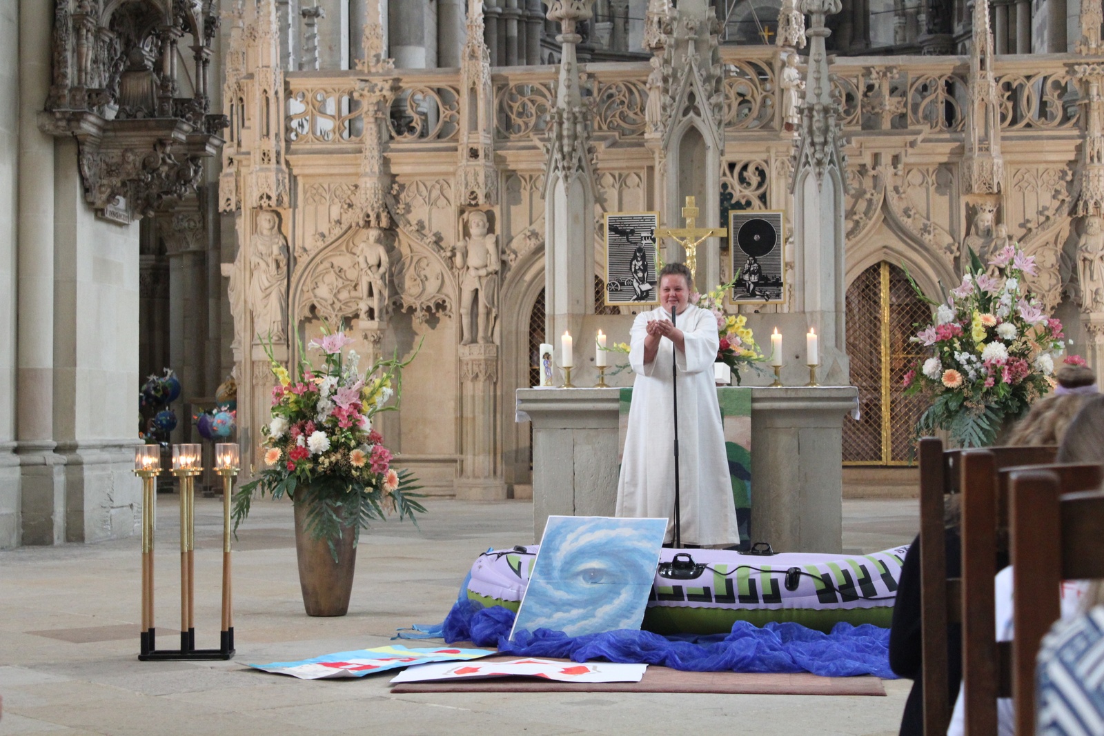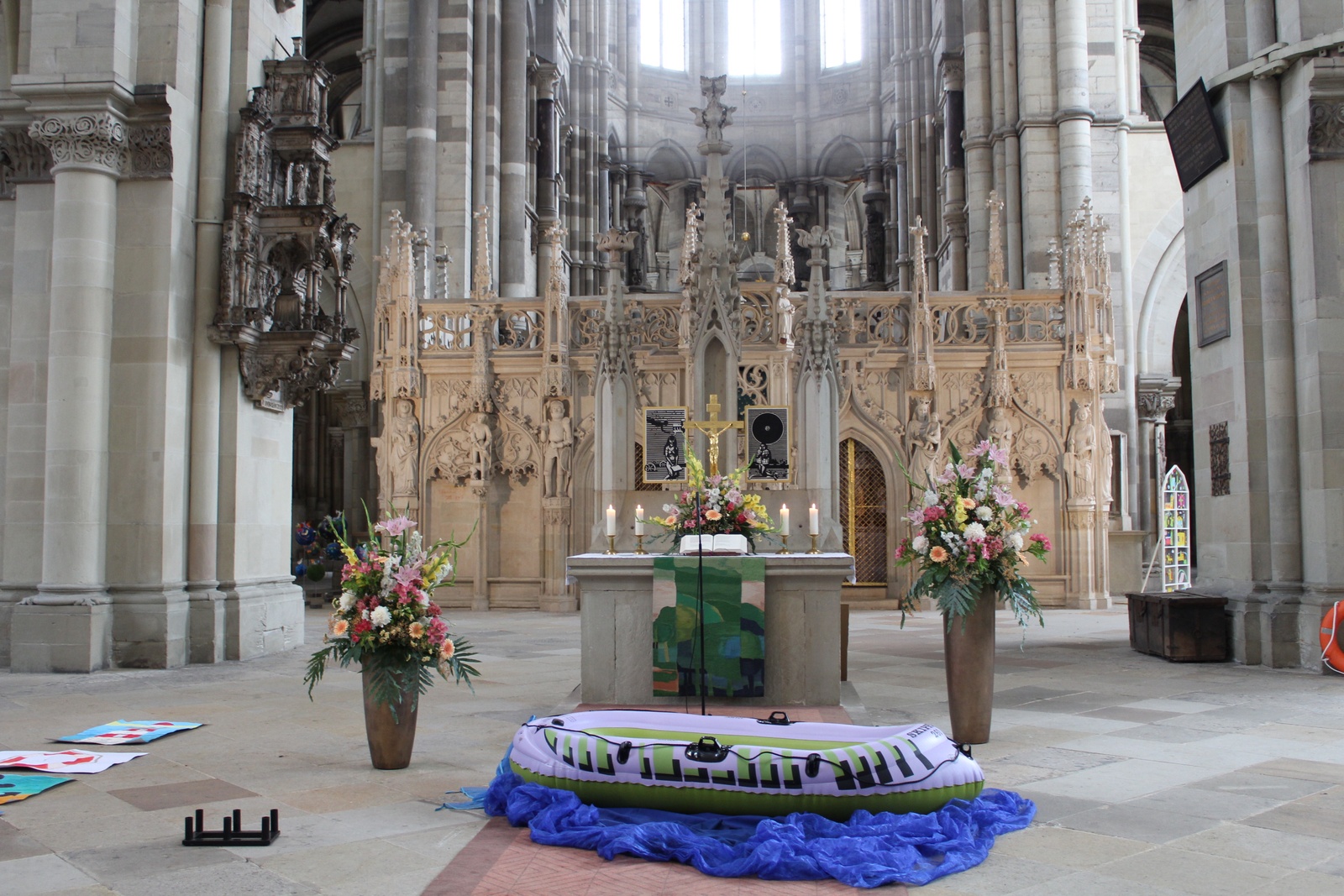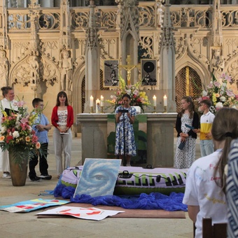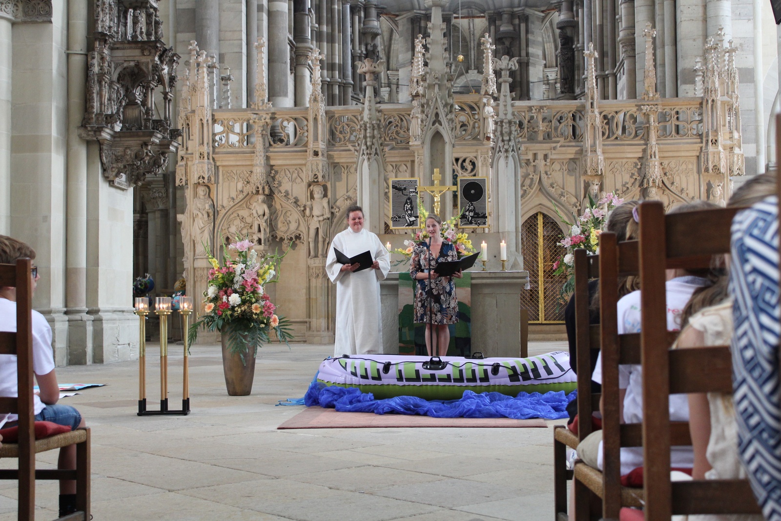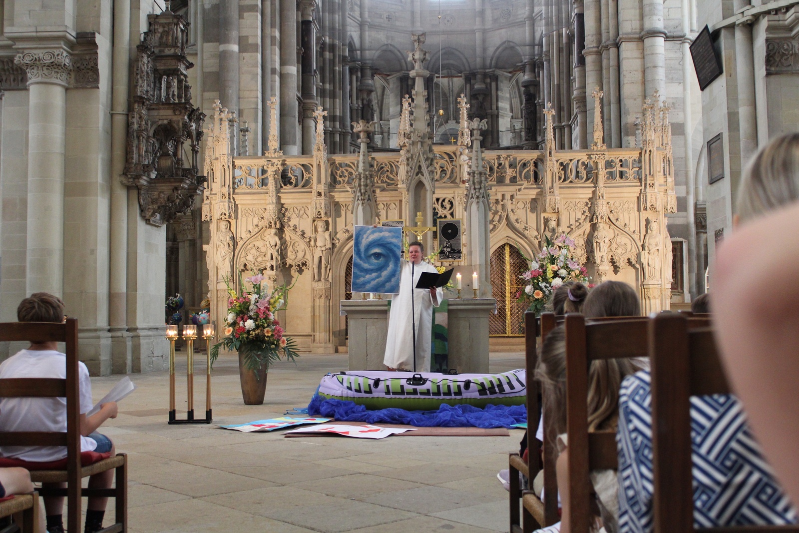 Unter dem Motto „Umsteigen auf neue Schiffe“ gestalteten Frau Schöpe, Frau Höptner-Dresely und Frau Fitz einen anschaulichen und abwechslungsreichen Gottesdienst. Die Kinder lauschten gespannt der Begrüßung durch Frau Schöpe und Frau Fitz und beäugten neugierig das Schlauchboot vor dem Altar. In der Verkündigung verrieten die Kinder der Klasse 3b der Gemeinde, was so alles zu einem guten Schiff gehört und wie es den Passagieren nützen kann. Kompass, Anker, Rettungsring und Leuchtturm sind unverzichtbar auf der weiteren Reise auf dem nächsten Schiff, auf das die Kinder nun wechseln… Nahtlos daran schloss Frau Fitz ihre Predigt an. Das Auge im Sturm – die völlige Ruhe im Chaos – und das nötige Gottvertrauen auch bei unruhiger See waren das Thema der Predigt.