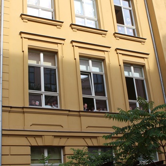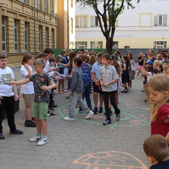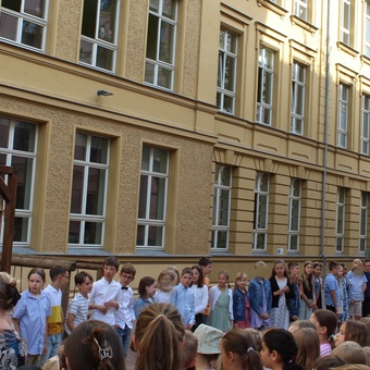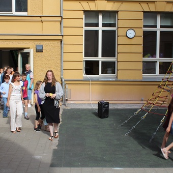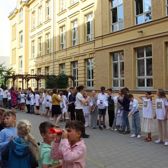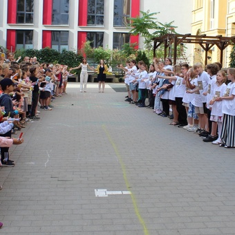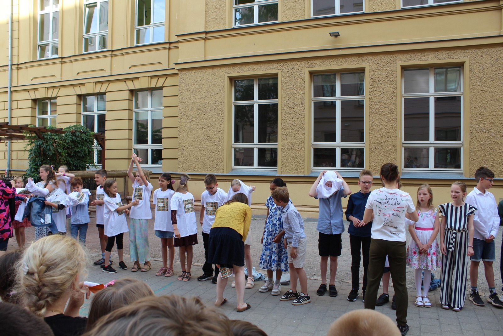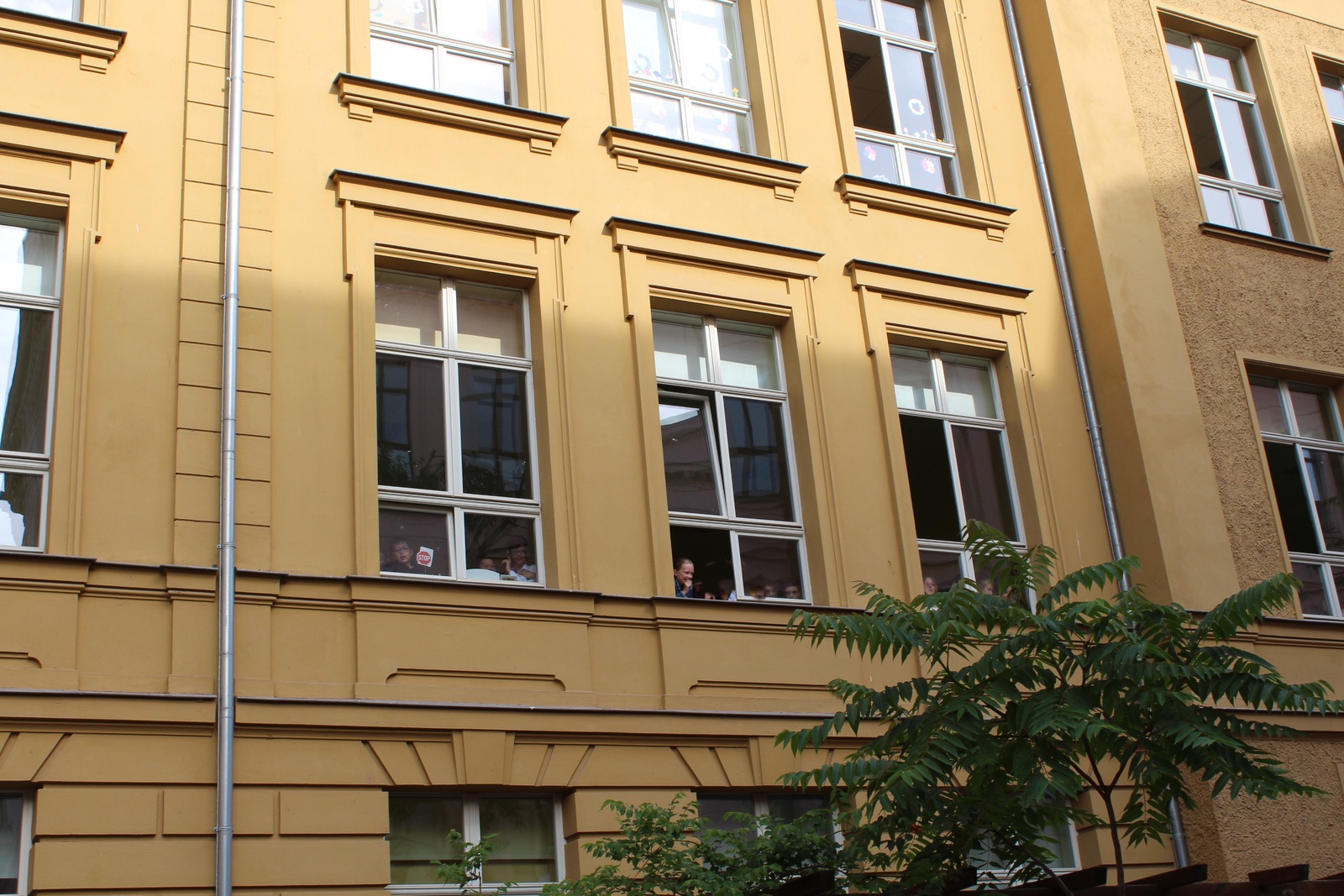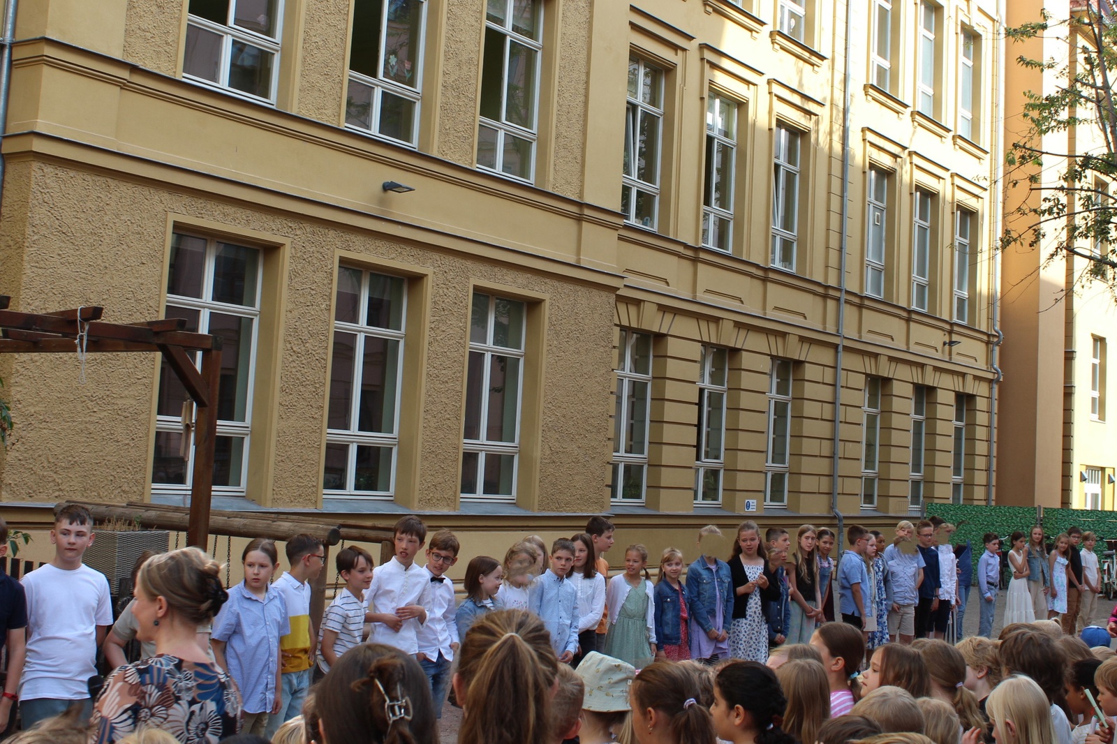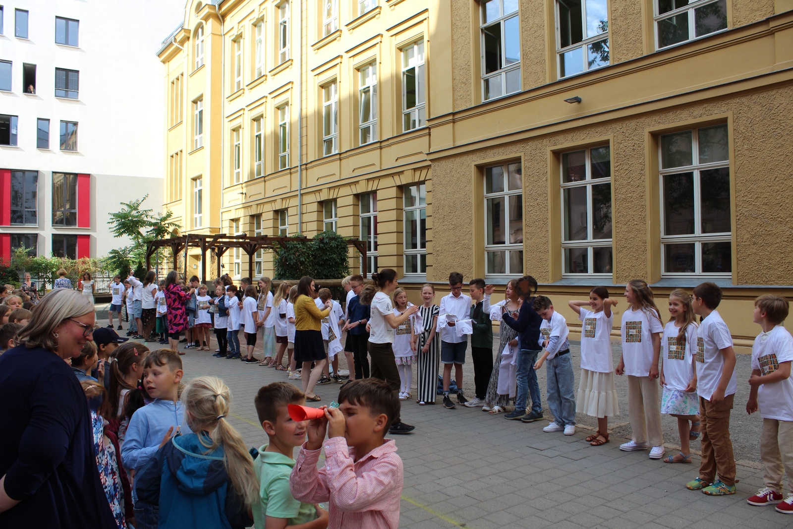 Traditionell wartete die Schulgemeinschaft auf dem Schulhof, die Vierer lauerten hin den Fensterscheiben der nun bald ehemaligen Klassenraumfenster.