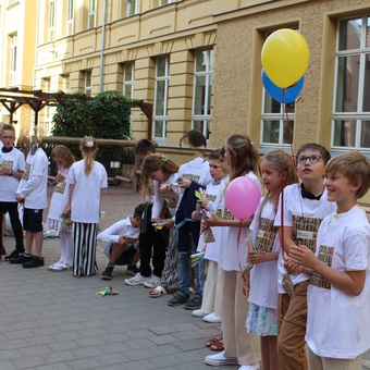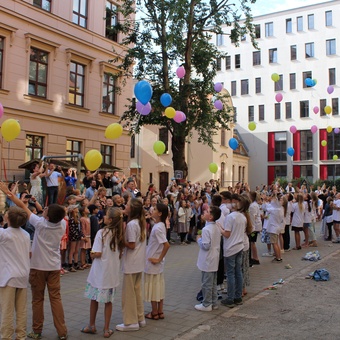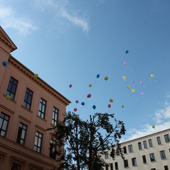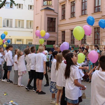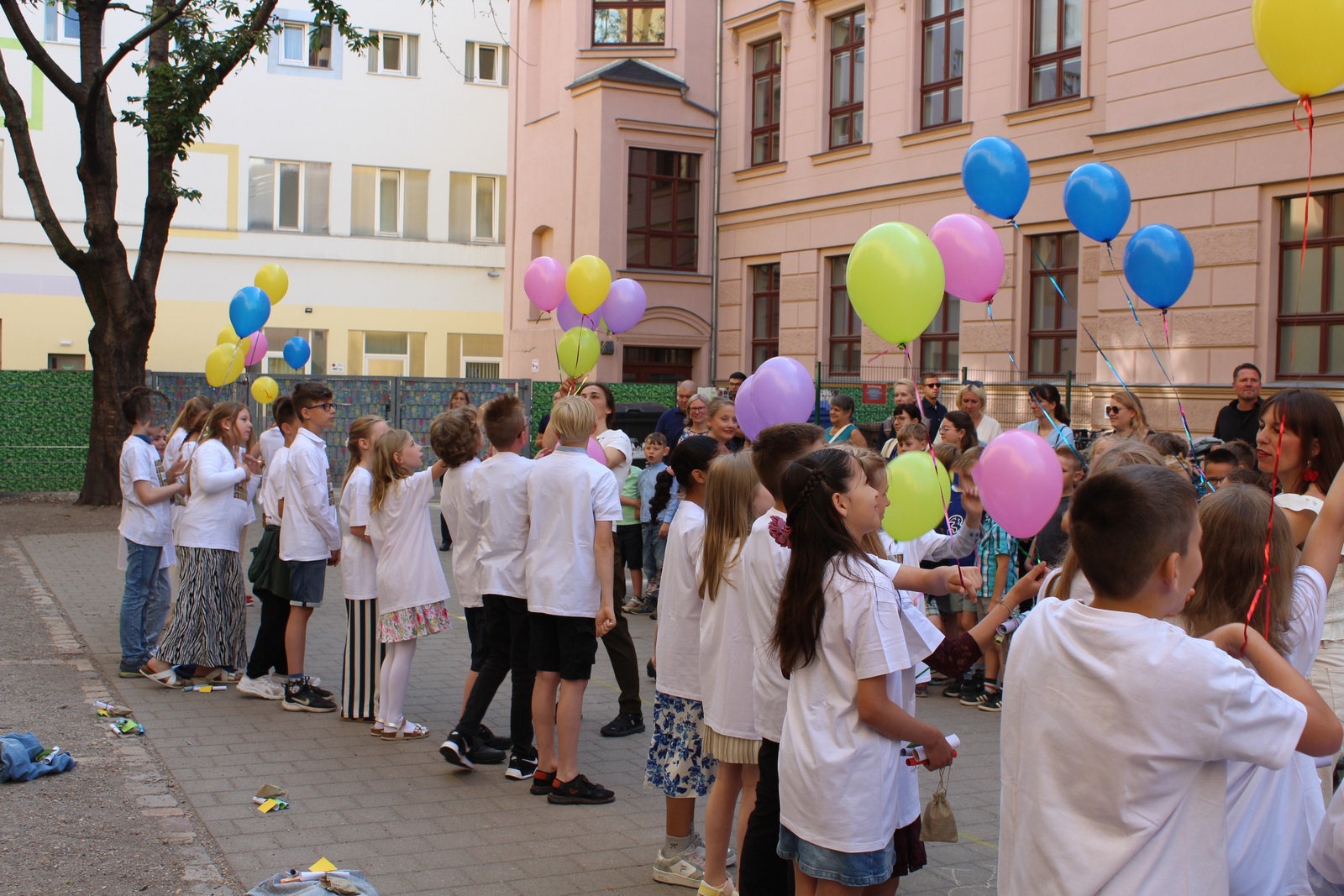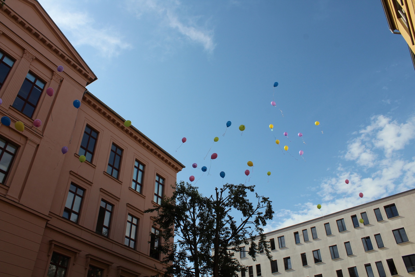 Es naht der Höhepunkt der Verabschiedung auf dem Schulhof… Die Luftballons werden verteilt und jedes Kind gebeten, den Luftballon gut festzuhalten. – Trotzdem hat es ein Ballon geschafft, verfrüht zu starten… Darauf ist jedes Jahr Verlass.