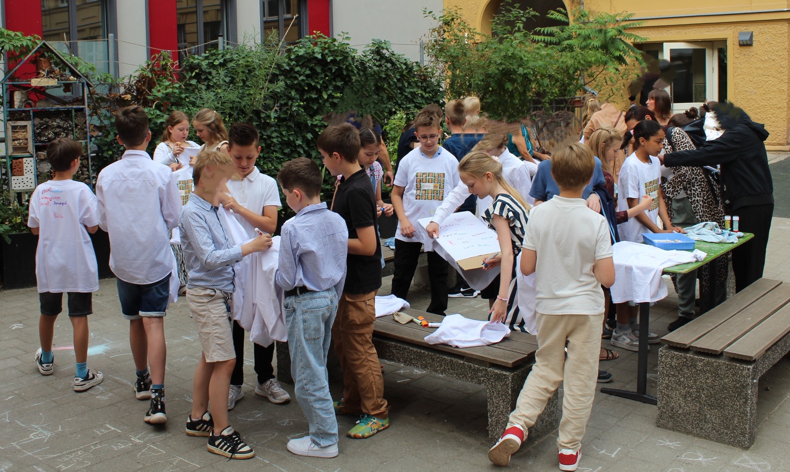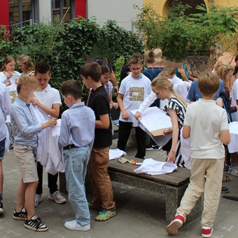 Ordentlich aufgereiht erhielten sie die Klassen-Shirts, die sofort übergestreift und stolz getragen wurden. Darauf sangen alle zusammen das Flusslied, auch eine liebgewordene Tradition der Schulgemeinschaft.