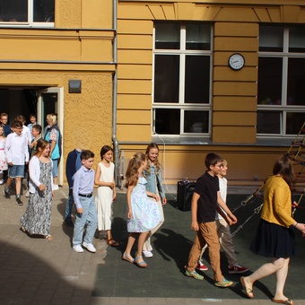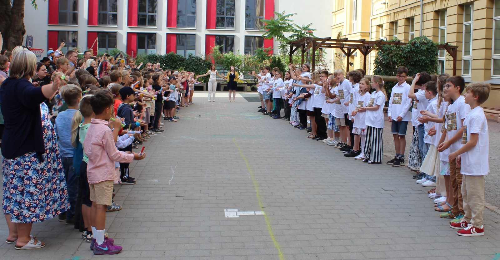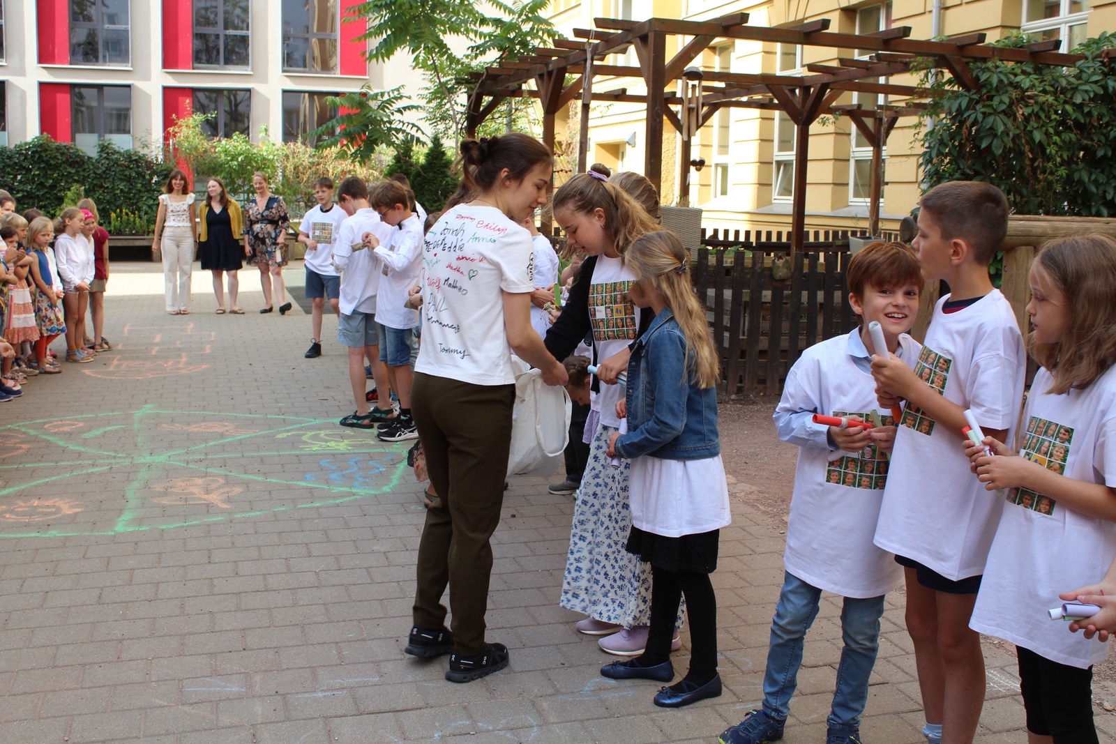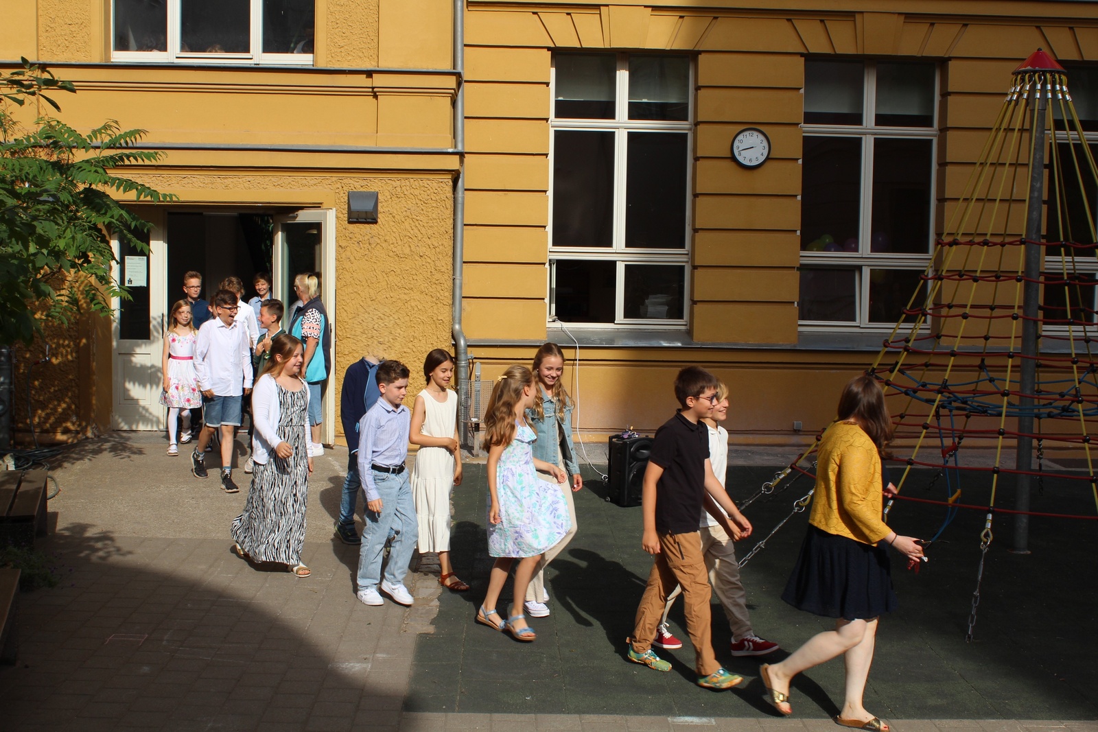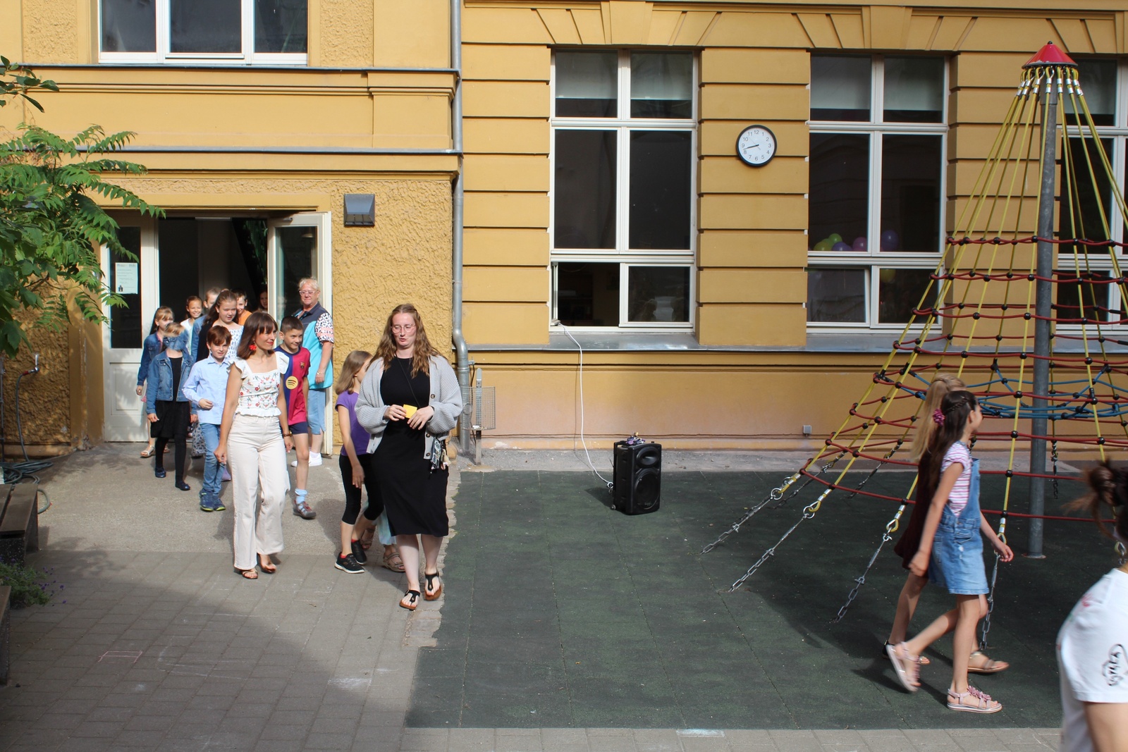 Dann ging es los, sie traten auf den Schulhof, begleitet vom Applaus der Kinder und Erwachsenen.