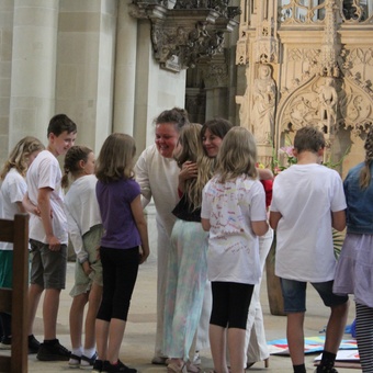 Nachdem Frau Fitz den Segen gesprochen hat, zog die Gemeinde aus und verabschiedete die ältesten Kinder der Schulgemeinschaft.