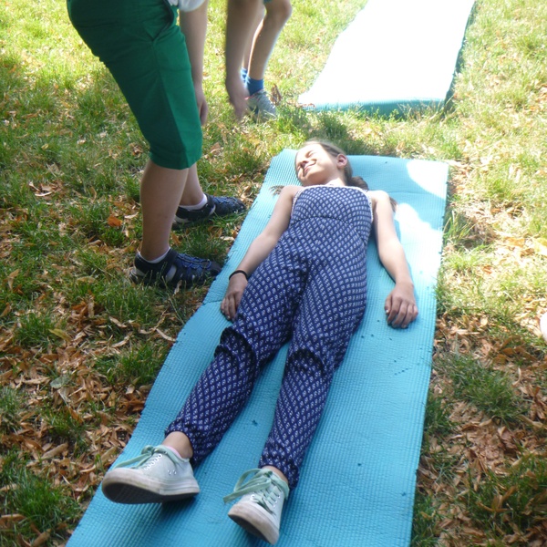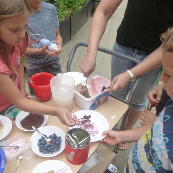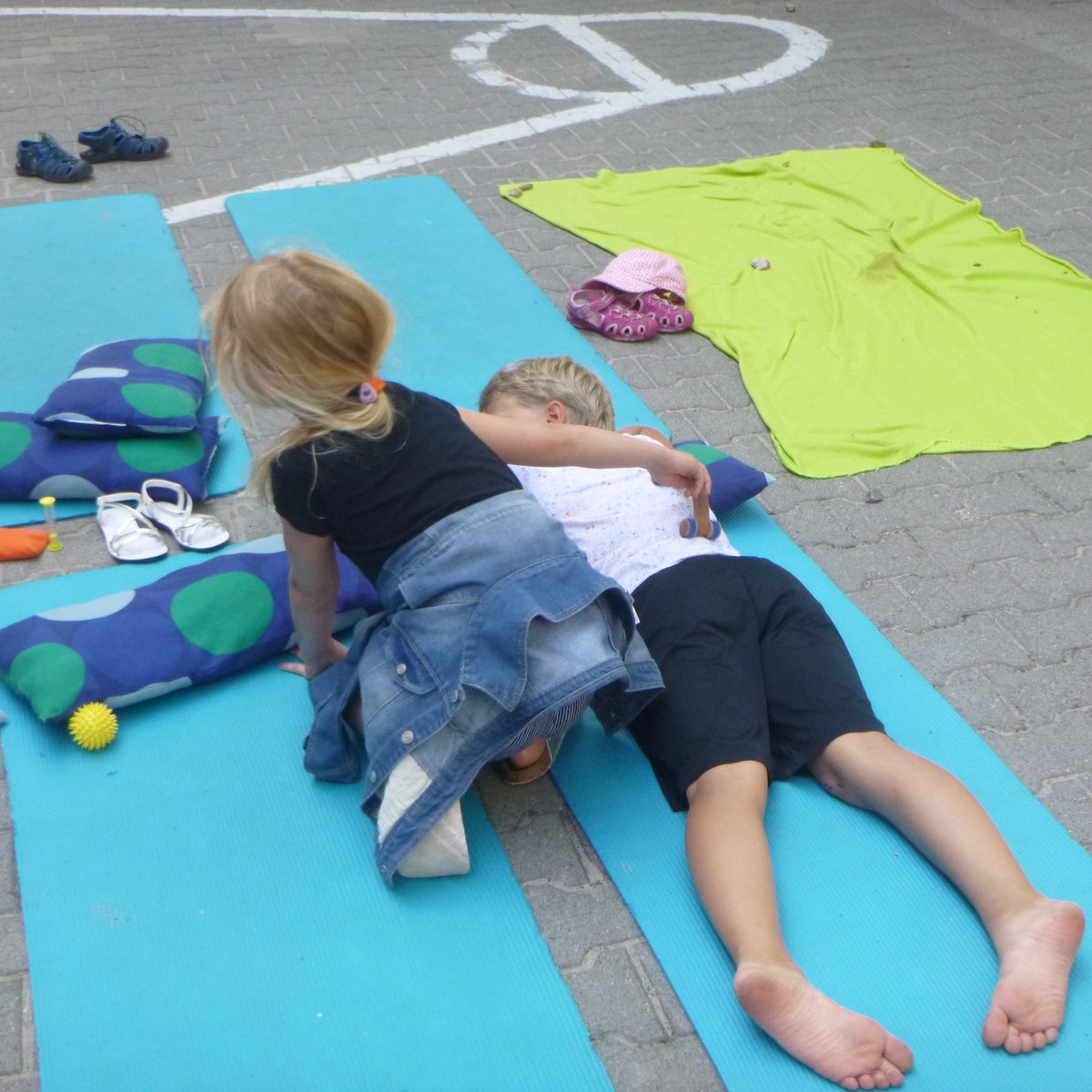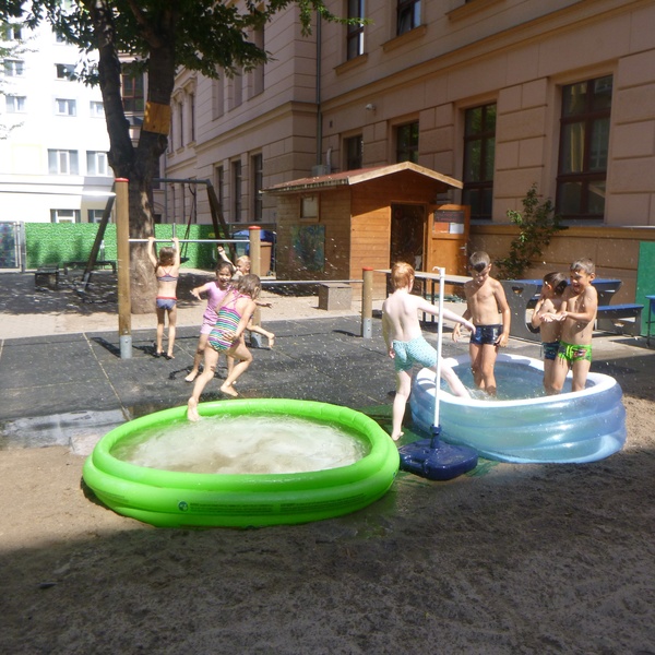 Aufgrund der Sommertemperaturen gönnten wir dem gesamten Projekt in der 4. Ferienwoche eine Pause und gestalteten auf dem Schulhof eine Badelandschaft mit Bademeister, Eisverkäufer, Hausmeister, Pool und Sandstrand. Die Kinder genossen dann ihre berufliche Auszeit mit mehreren Besuchen des Carl- Miller Bades.