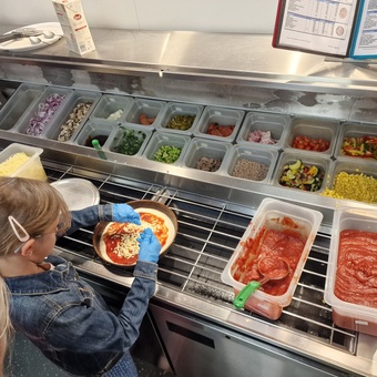 In Woche 2 hieß es: „Geschmackssache“- alles drehte sich um die verschiedenen Geschmacksrichtungen, die wir mit unserer Zunge wahrnehmen können. Neben interessanten Darstellungen, welche Teile der Zunge was genau schmecken, gab es auch Essensrekorde zu bestaunen. Am Dienstag brachten wir uns Schlafmasken oder einen Schal zum Verbinden der Augen mit. Wir aßen unser Frühstück und die Vesper mit verbundenen Augen. Das ging nicht immer gut, aber war sehr lustig und alles schmeckte viel intensiver. Bei unserer Snackstrecke wurde unsere Zunge stark strapaziert. Es gab Süßes, Salziges, Bitteres, Saures, Scharfes und Undefinierbares zu erschmecken. Am Ende der Strecke gab es ein Experiment mit Wasser. Drei verschiedene Wassersorten zum Probieren: Leitungswasser, Wasser aus einer Glasflasche und Wasser aus einer PET- Flasche. Zum Erstaunen aller Kinder wurde unser Leitungswasser als das am besten schmeckende Wasser gewählt. Am Mittwoch wanderten wir zum Fürstenwall, wo plötzlich Neptun mit seinen Fängern erschien und in alter Tradition einige von unseren Kindern auf einen lustigen Namen taufte, der dann durch ein spezielles Wundergetränk besiegelt wurde. Am Donnerstag wurde es dann richtig lecker. Ein Teil der Kinder durfte mal hinter die Kulissen einer Pizzeria schauen und sich selbst eine eigene Pizza zusammenstellen und natürlich dann auch essen. Die anderen Kinder vernebelten das ganze Schulgebäude mit leckerem Brötchenduft. Den ganzen Vormittag wurde Teig hergestellt, geknetet, ausgerollt und gebacken. So hieß es zum Mittag: „Es ist angerichtet!“ Es gab Würstchen im Schlafrock, Pizzaschnecken, Handbrot mit Käse und Schinken, Müslibrötchen und zum Abschluss süße Schoko-Schnecken. Wir waren richtig vollgefuttert.