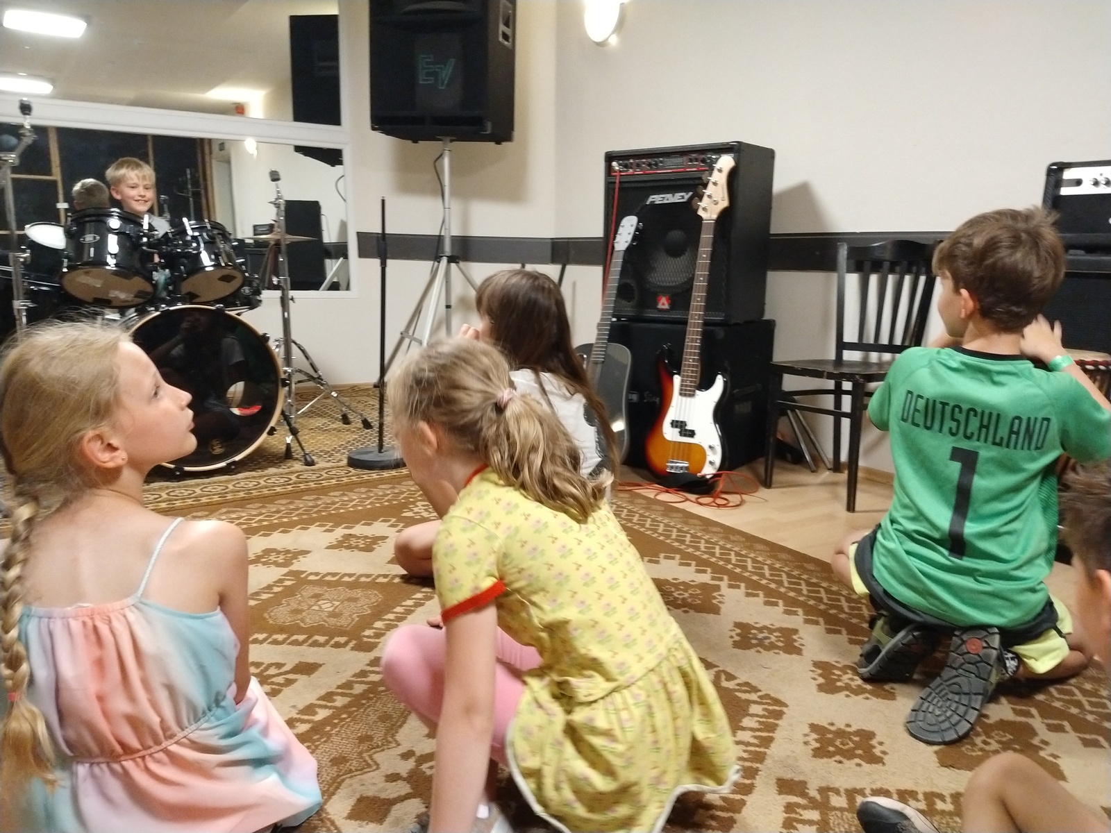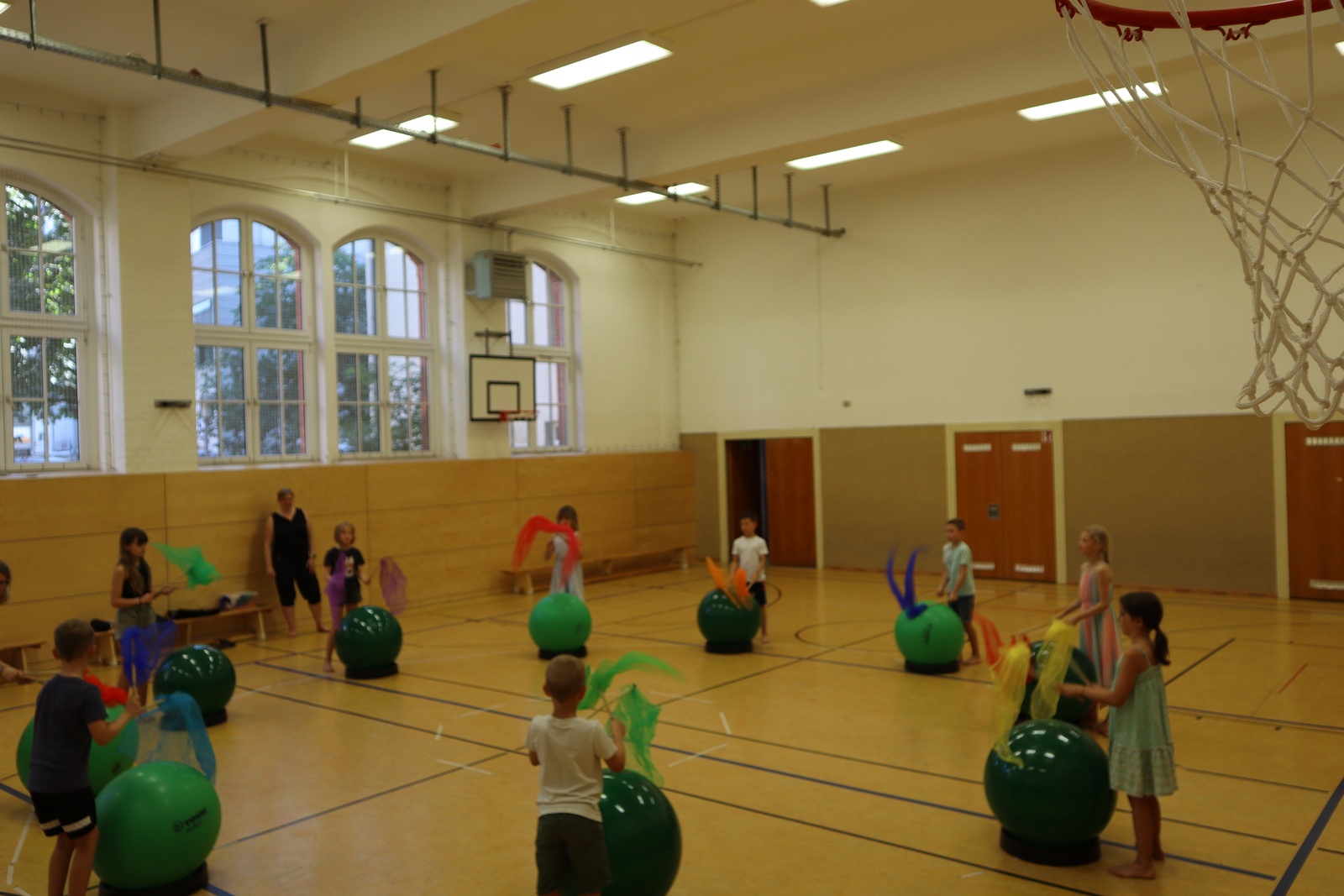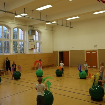 Die 3. Woche stand unter dem Motto: „Hör gut zu“ und war prall gefüllt mit großartigen, akustischen Erlebnissen und unsere zukünftigen Erstklässler durften ab jetzt in den Hort kommen. Wir begannen mit einem Teamspiel, bei dem wir uns ganz auf unsere Ohren konzentrieren mussten, um die versteckte Schnecke in der Turnhalle zu finden. Das war echt schwer. Am Dienstag ging unser Ausflug zum Domfelsen. In mehreren Gruppen konnten wir mal die Elbe hören. Unsere Eindrücke stellten wir anschließend in einem Bild aus verschiedenen Naturmaterialien dar. Es war spannend, was so jeder gehört hatte. Der Mittwoch war aufgeteilt: unsere Erstklässler machten einen Ausflug ins Carl- Miller- Bad und die anderen Kinder besuchten das Gröninger Bad. Während die Erstklässler planschten, konnten die anderen Kinder verschiedene Räume erleben und in Geräuschen „baden“. Instrumente wurden ausprobiert, im Tonstudio wurde eine kurze Szene aufgenommen und mit verschiedenen Geräuschen untermalt.- Wie DAS die ganze Stimmung verändern kann! Am Donnerstag wurde unsere Turnhalle mit Pezzibällen und Drum-Sticks ausgestattet und wir probierten uns bei Drums-Alive aus. Von leisen Regentropfen bis „We will rock you“ trommelten wir auf den Bällen und waren erstaunt, wie schnell so eine Stunde vorbei geht. Der Abschluss der Woche fand bei einem Blinden- Fußball- Turnier in der Turnhalle statt.