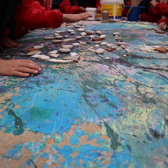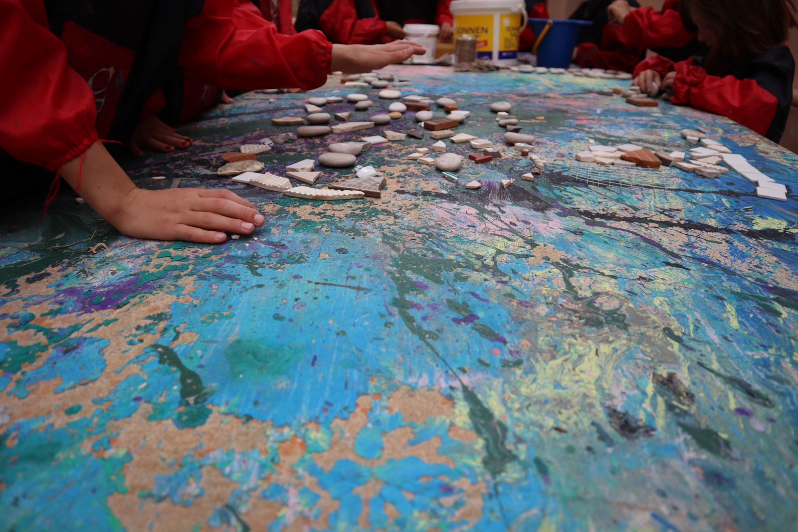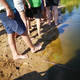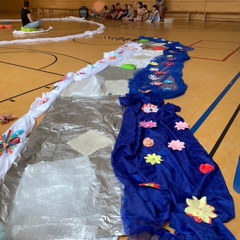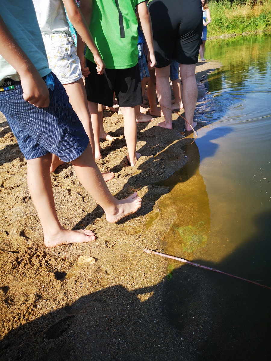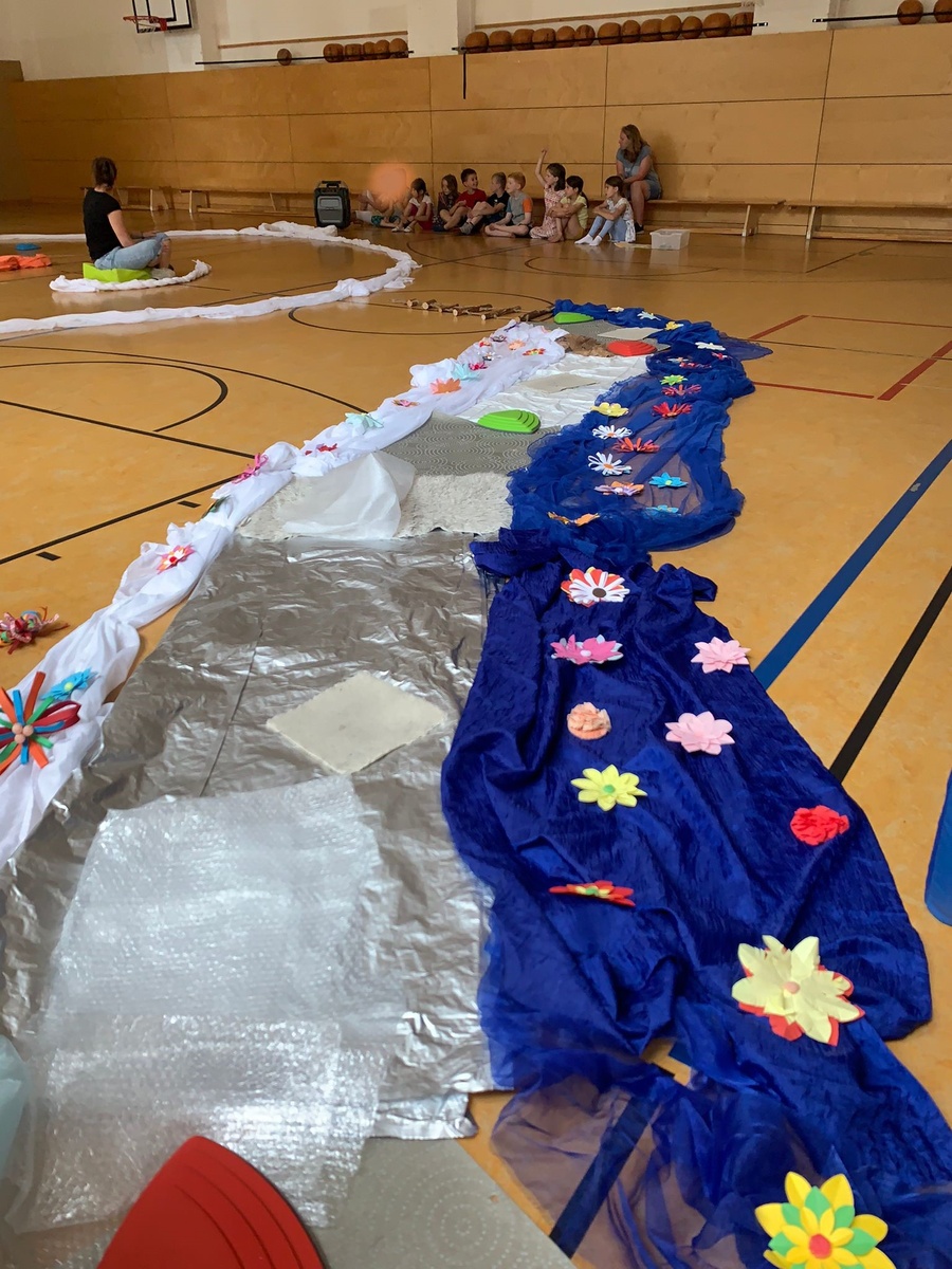 In der letzten Woche 5 tauchten wir ab in die „WohlFÜHLoase“ und ertasteten im Morgenkreis schon verschiedene Materialien und Gegenstände. Am Dienstag ging unser Ausflug zum Wasserfall, den wir barfuß erkundeten und die unterschiedlichen Strukturen des Bodens fühlten. Auch mal kurz mit dem Fuß ins Wasser durften wir gehen und wurden dabei kurzerhand auf lustige Namen getauft. Der Mittwoch war so warm, dass wir kurzerhand das Wasser im Freibad fühlen wollten. Ein großes Fühlbild entstand am Donnerstag und Freitag aus Naturmaterialien, die die verschiedenen Strukturen abbilden. Das Bild kann nun auf dem Schulhof am Schuppen bestaunt und vorsichtig befühlt werden. Wohlfühlen konnten sich die Kinder am Freitag bei einer Entspannung mit selbst hergestellten Gesichtsmasken.