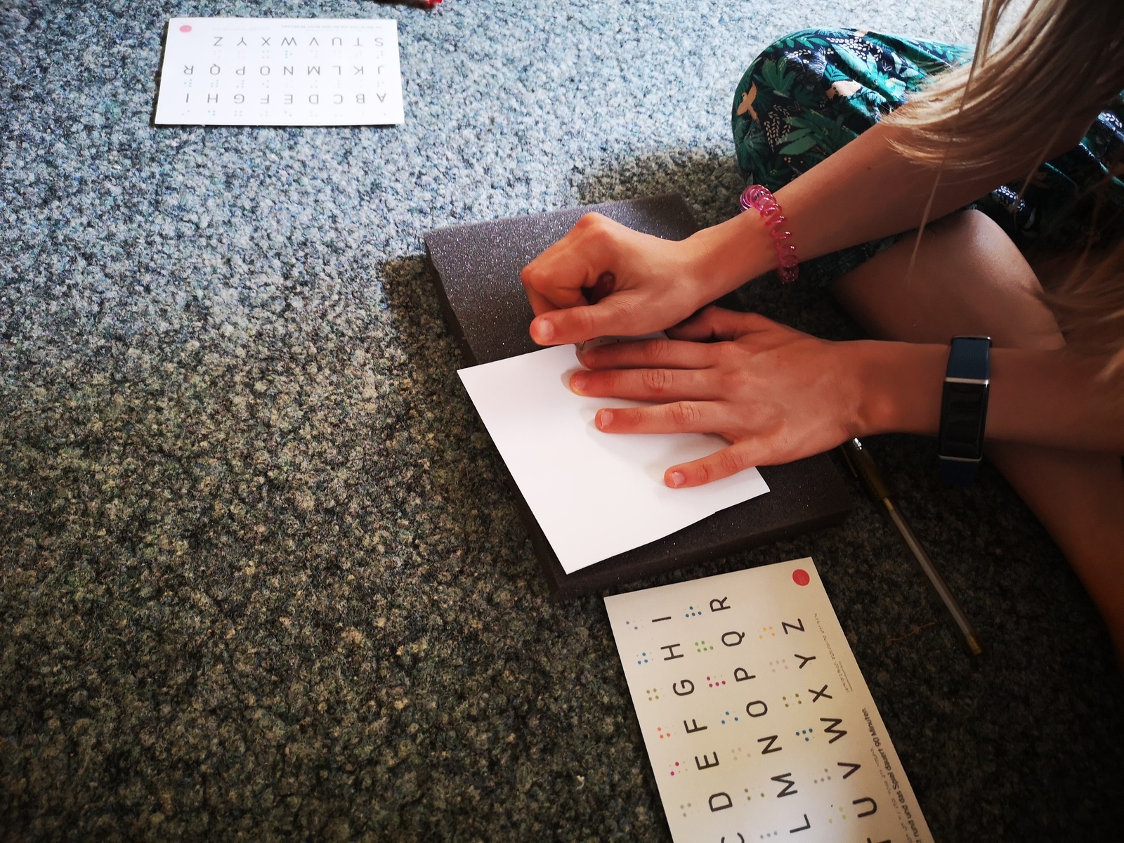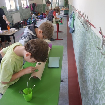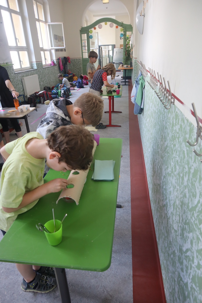Woche 1 startete unter dem Thema „Ich sehe was, was du nicht siehst“ und einem Morgenkreis in der Turnhalle, der jeden Montag in der gleichen Reihenfolge ablief, wobei das anstehende Wochenthema durch eine besondere Aktion hervorgehoben wurde. Die Kinder konnten aus einem Wimmelbild die Details herausfinden, was gar nicht so einfach war. Am Nachmittag durften wir bei einem Blindenparcours herausfinden, wie es sich anfühlt, ohne das Sehen die eigne Umwelt wahrzunehmen. Die Blindenschrift ist gar nicht so einfach zu ertasten. Wir haben es ausprobiert und versucht zu lesen. - Das war wirklich eine Herausforderung. Es folgten die zwei heißesten Tage des Jahres und alle waren froh, dass wir diese im Carl-Miller-Bad verbringen konnten. Das Highlight der Woche war unser Ausflug ins „Phaeno“ Wolfsburg. Getreu unserem Thema konnten wir hier die Sinne auf die Probe stellen. Am letzten Tag wurden erneut die Wasserspiele auf dem Schulhof abgehalten. Ach, eins fehlt noch, in der Schule wurde die ganze Woche alles gründlich gereinigt und auf Hochglanz poliert, die Kantine war geschlossen. Also haben wir uns die ganze Woche selbst versorgt und auch gekocht.