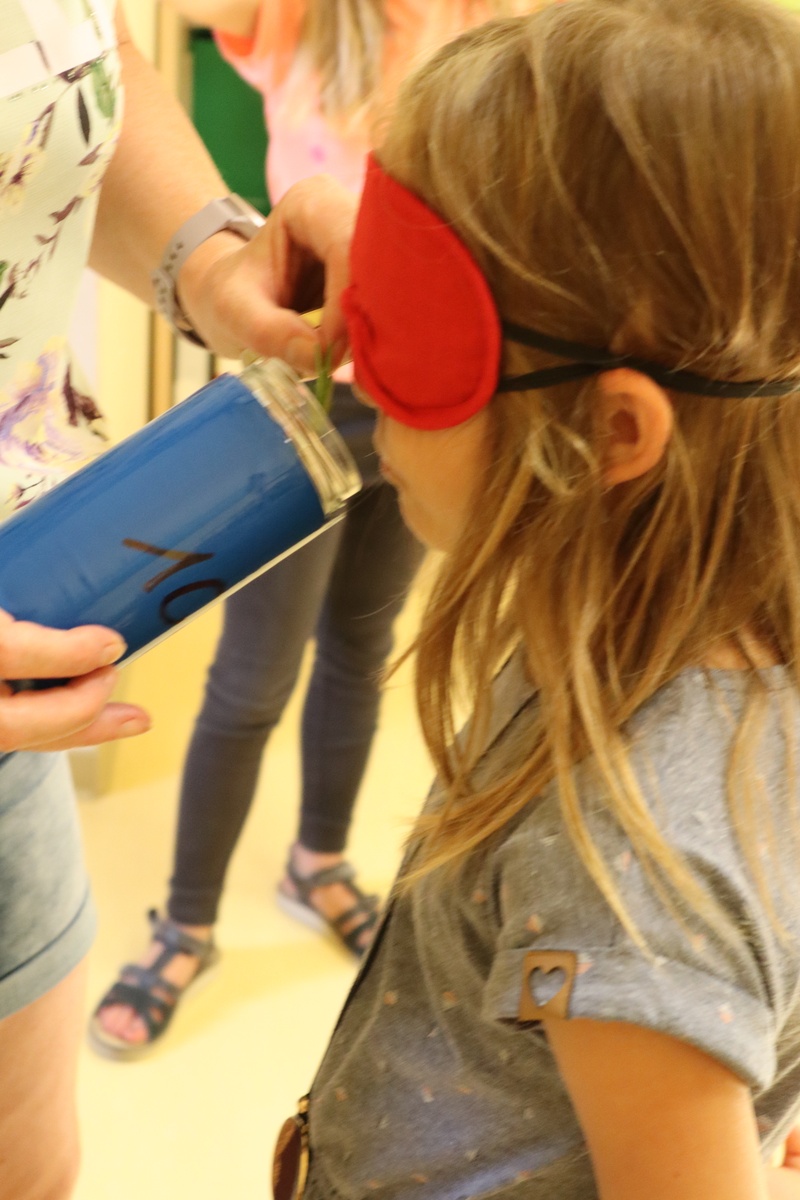 In der 4. Woche machten wir „Die Reise durch die Welt der Düfte“, es konzentrierte sich alles auf die Nase und das Riechen. Schon beim Morgenkreis kamen die berühmten „stinkenden Socken“ zum Einsatz. Allerdings kam der Geruch von den unterschiedlichen Füllungen, wie zum Beispiel Knoblauch, Zwiebeln und Lavendel. Beim Geruchsmemory wurde der „Riechkolben“ stark beansprucht und einige Gerüche waren echt ekelig! - Sardellen waren auch dabei! Unsere Ausflüge führten uns in die Gewächshäuser, ins Carl- Miller-Bad und zum Gradierwerk in Schönebeck. Während die Luft in den Gewächshäusern eher tropisch und frisch war, lag Salz in der Luft am Gradierwerk, was man sogar auf den Lippen spürte. Das salzige Wasser an der Quelle wurde von allen Kindern probiert…. es schmeckte furchtbar salzig und musste häufig ausgespuckt werden. Das Spielen kam natürlich nicht zu kurz und konnte sowohl im Freibad als auch auf dem Spielplatz am Gradierwerk ausgekostet werden. Abgeschlossen wurde die Woche mit dem Herstellen von duftender Seife und mit den Urkunden für das Riechmemory.