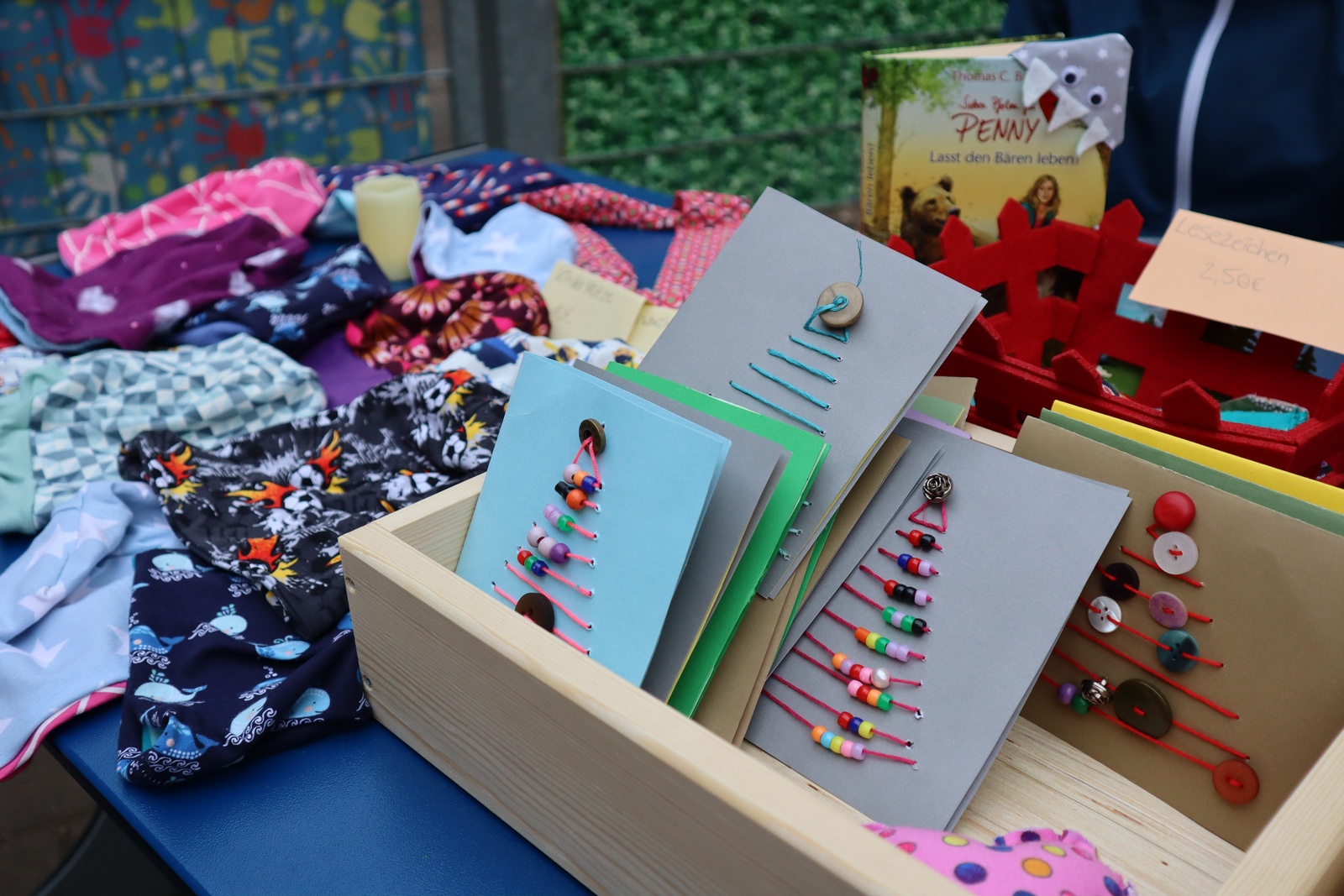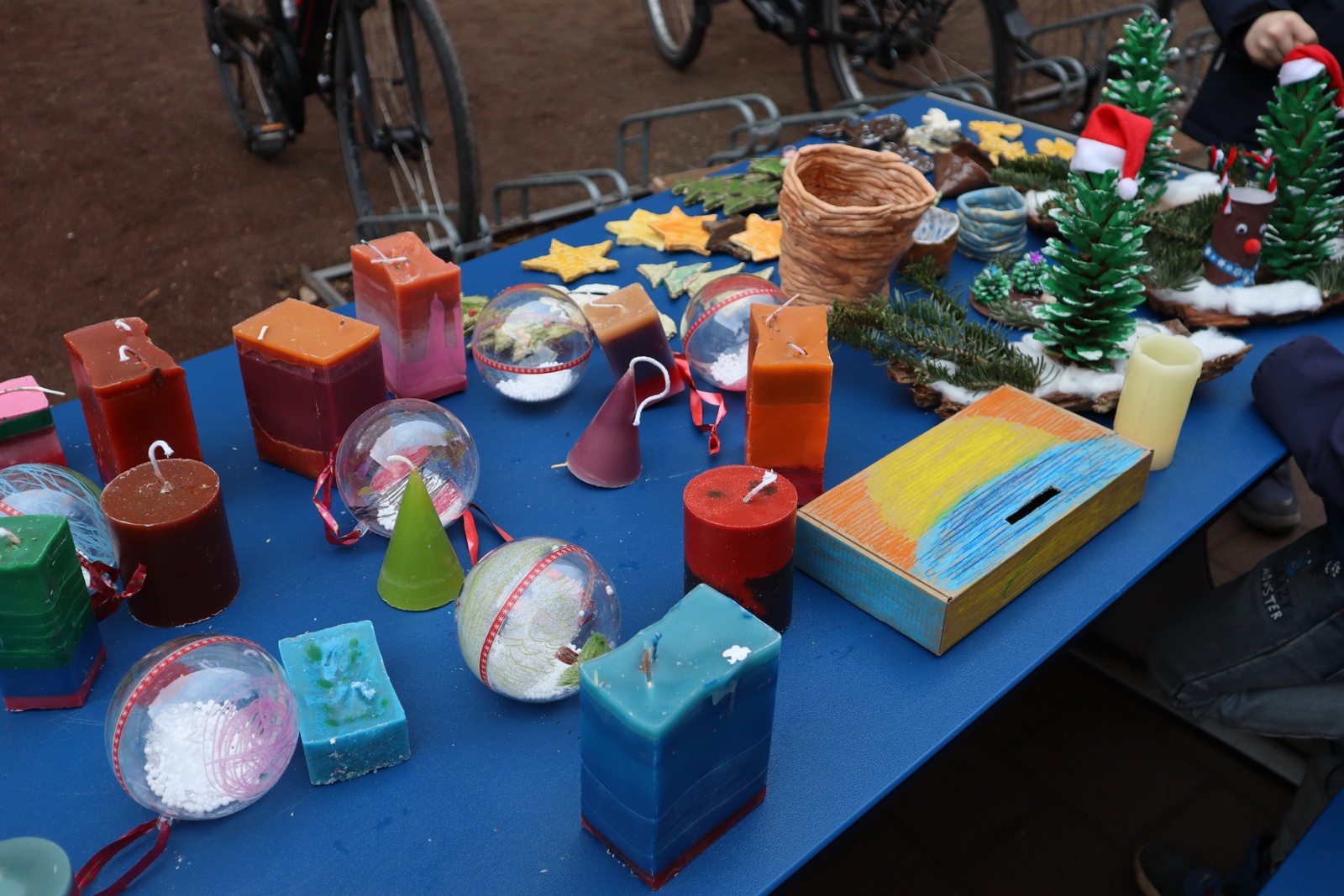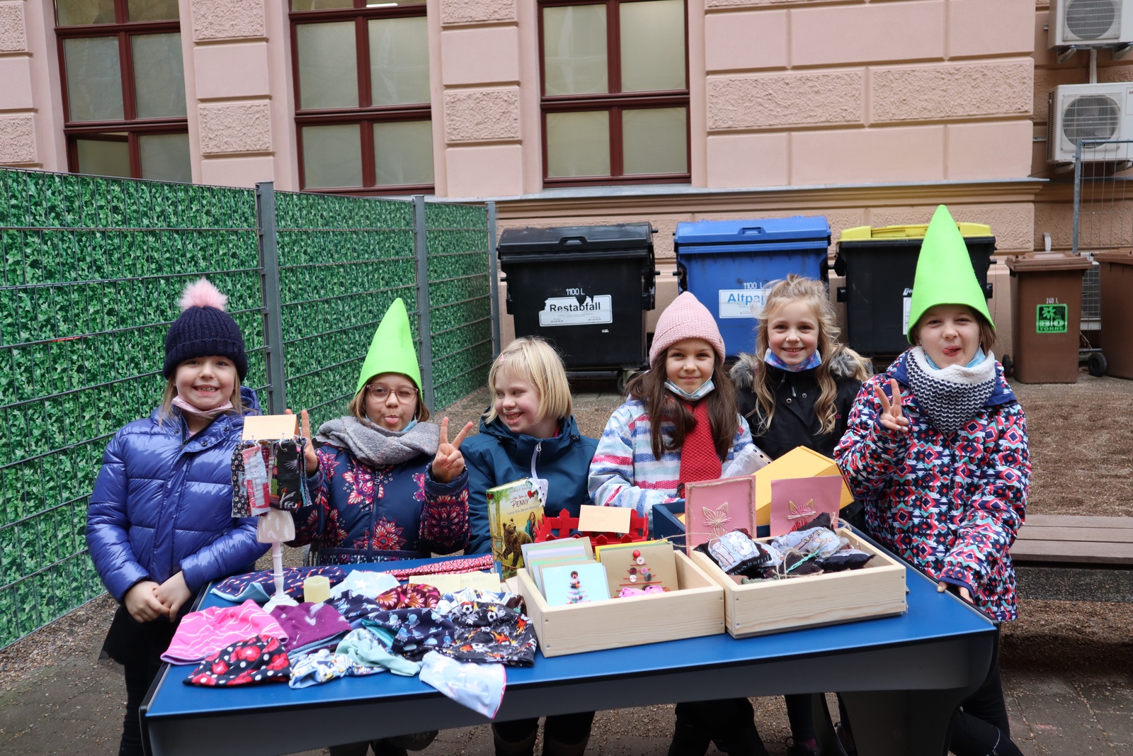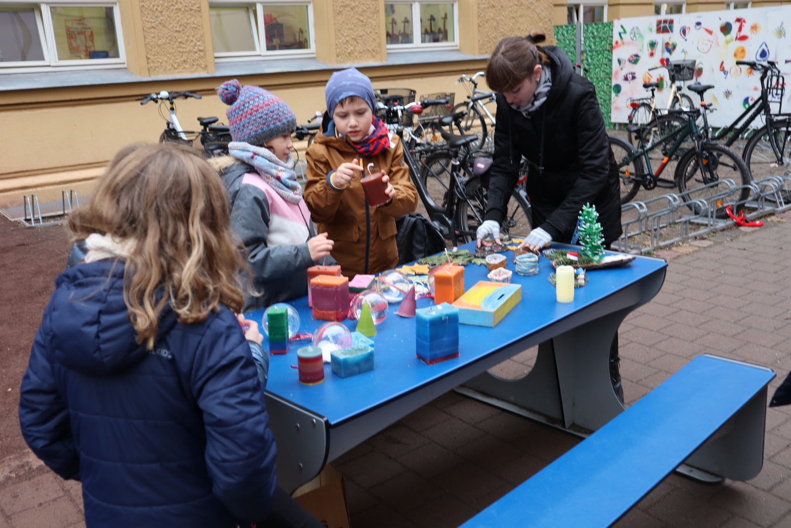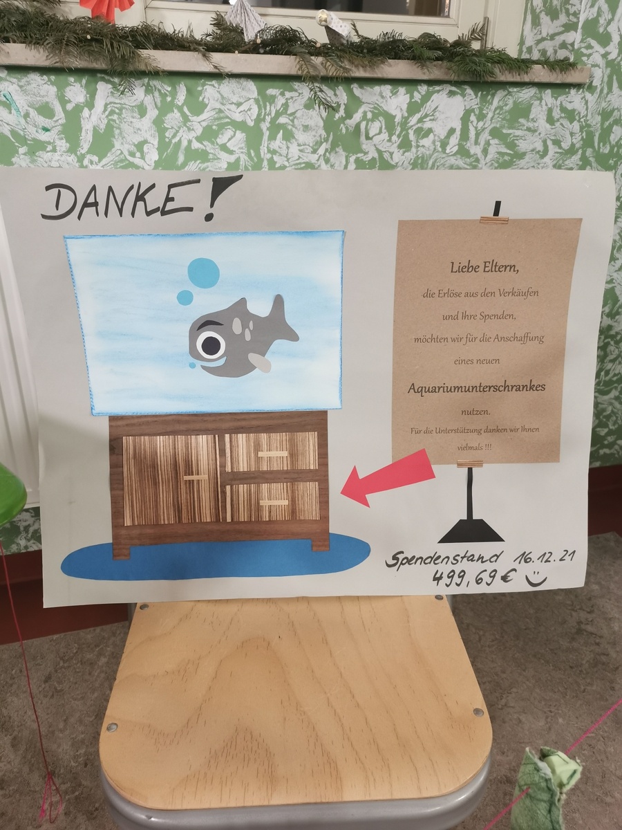 Auf einem Schulhofbasar werden die selbstgestalteten Werkstücke aus den verschiedenen AGs von den Kindern zum Kauf angeboten. Voller Stolz präsentieren sie den Eltern und anderen Familienmitgliedern die Kunstwerke. Der Erlös wird für den neuen Aquarium-Tisch in der Hortküche verwendet. Durch den Verkauf am 16.12.2021 wurden schon beinahe grandiose 500,-€ eingenommen. Ein herzliches Dankeschön an alle großzügigen Einkäufer!
